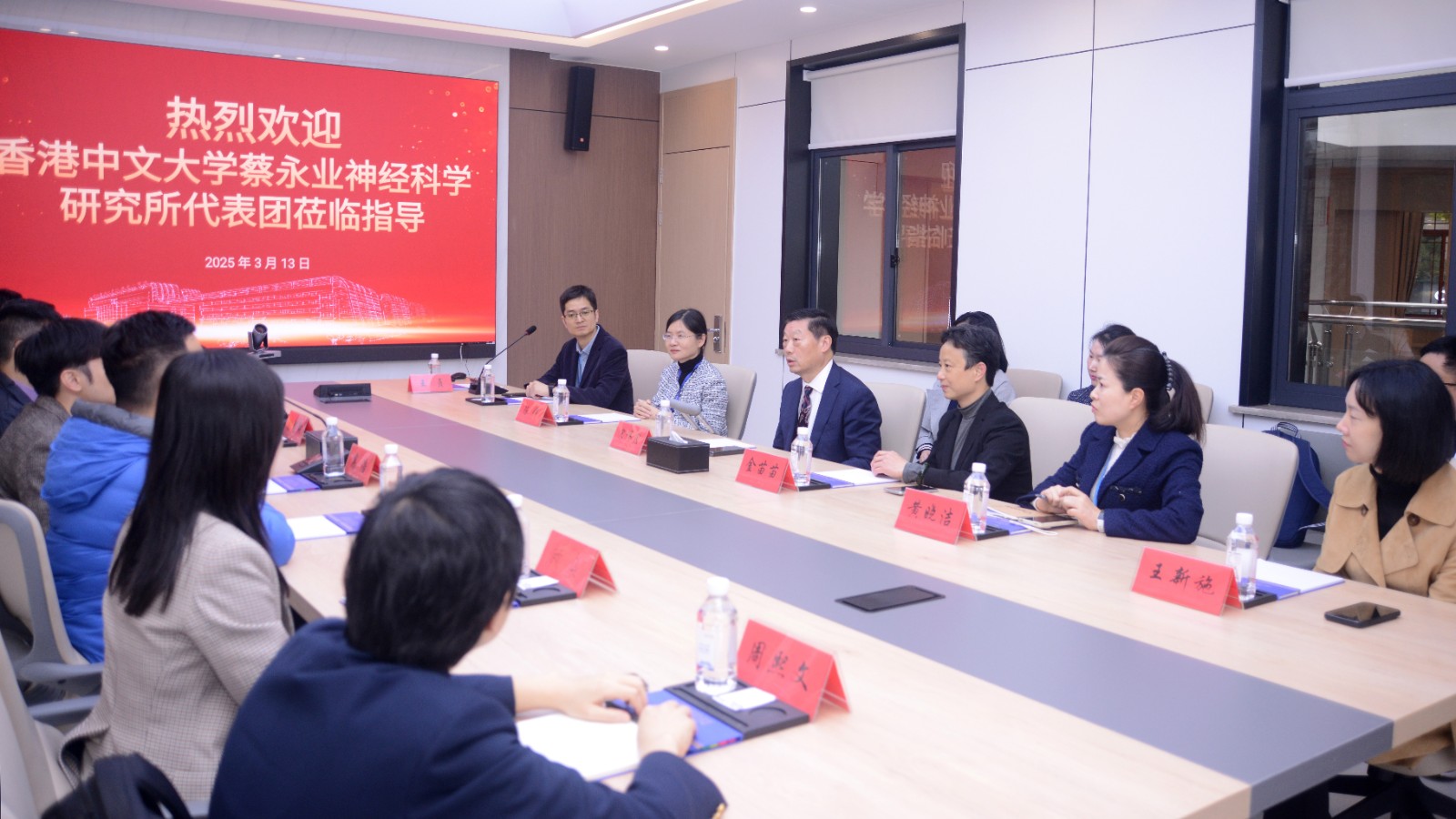 On March 13, a delegation of seven professors from the Choh-Ming Li Neuroscience Institute at The Chinese University of Hong Kong visited our hospital. The delegation was received by Vice President Xiaoying Huang of our hospital, along with directors from the Scientific Research Department, Dept. of Cooperation and Communication, Dept. of Neurology, Dept. of Geriatrics, and the Provincial Key Laboratory of Smart & Research and Translation of Tumor Biomarkers, among other relevant functional departments, clinical units, and laboratory staff in charge. Both sides engaged in in-depth discussions on topics such as clinical research in neurology, the development of geriatric medicine, and joint laboratory construction, reaching a preliminary consensus on signing a strategic cooperation intent agreement. This laid a solid foundation for subsequent substantive collaborations.