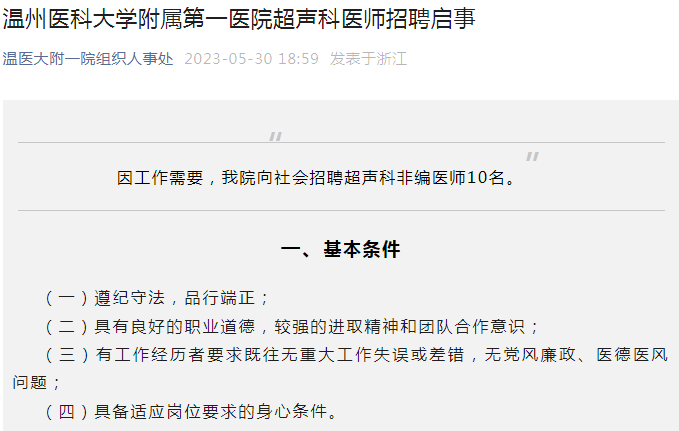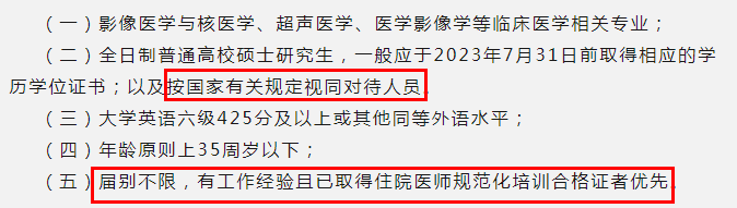 我院在2023年上半年超声科医师招聘启事中,明确了招聘对象“按国家有关规定视同对待人员”、“届别不限,有工作经验且已取得住院医师规范化培训合格证者优先。”