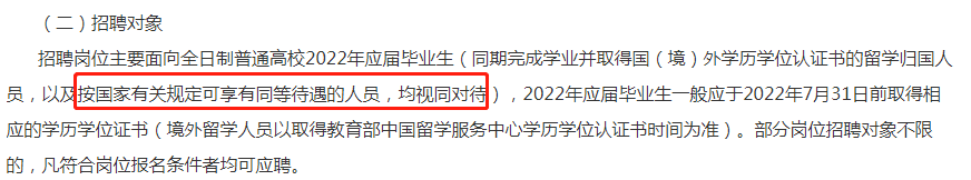我院积极响应贯彻“两个同等对待”政策,在2022年第一批公开招聘人员公告中,明确了招聘对象“按国家有关规定可享有同等待遇的人员,均视同对待”。