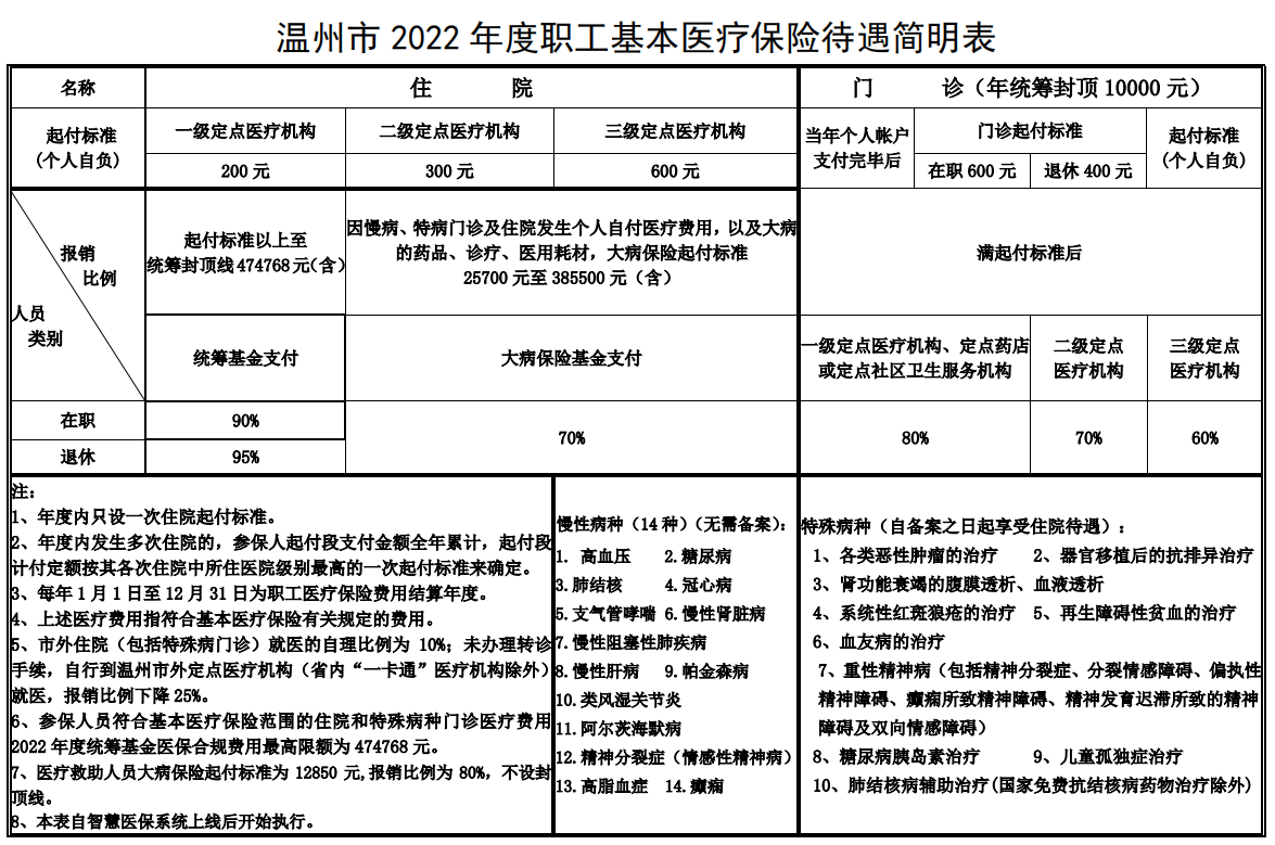 4、特殊病种门诊管理制度。职工医保和城乡居民医保特殊病种门诊范围按以下规定执行,待遇标准视同住院,其医疗费用列入统筹基金支付范围,具体病种为: