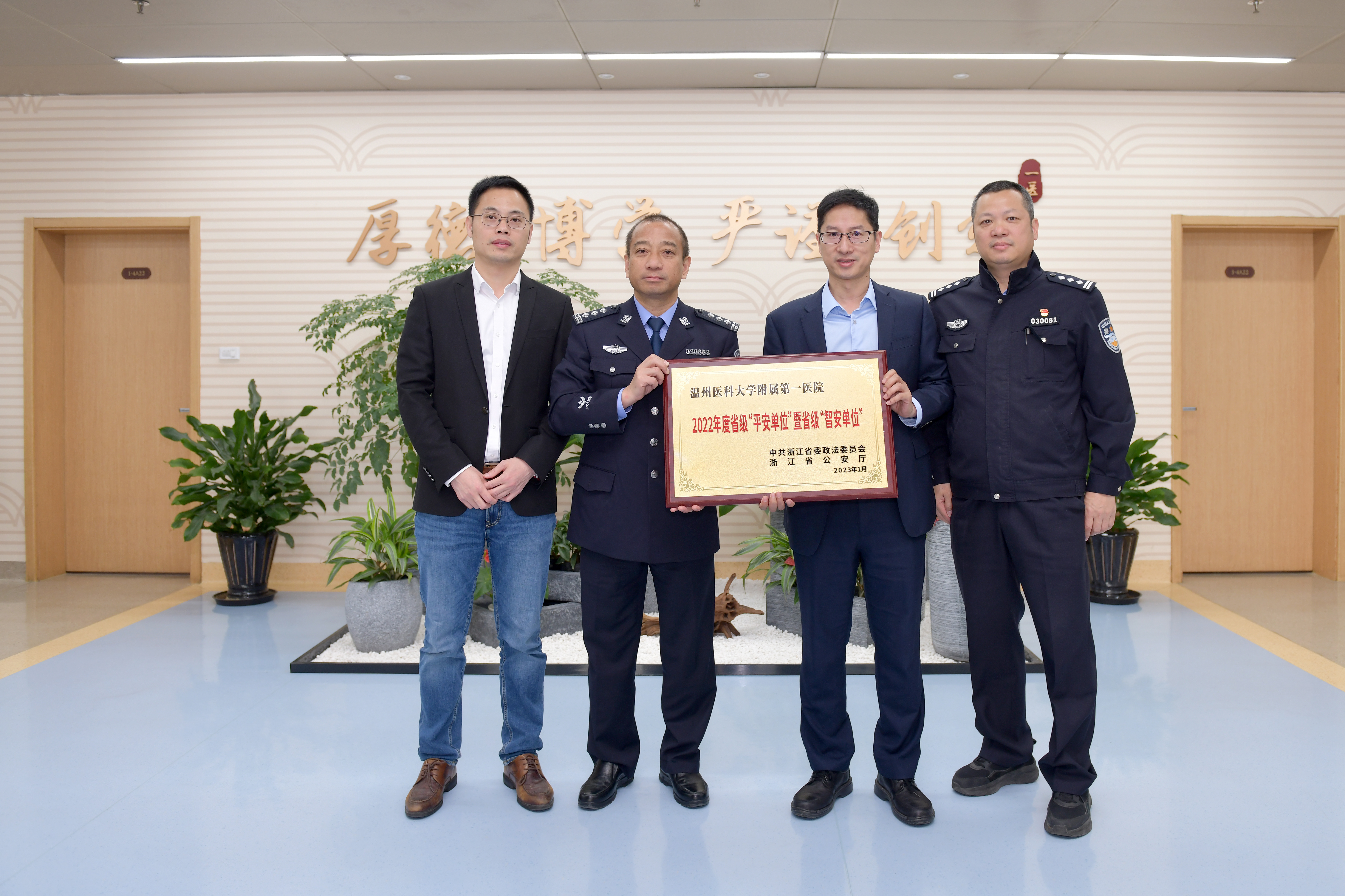 为进一步表彰我院在提升单位内部智慧安防能力,推进防控体系建设及维护治安秩序持续稳定方面的突出成绩,4月13日,温州市公安局基层基础支队副支队长何向东、二大队队长周静洁等一行来院,为我院授予省级“平安单位”“智安单位”铜牌并指导工作。副院长陈咨苗及保卫处相关负责人等出席授牌仪式。