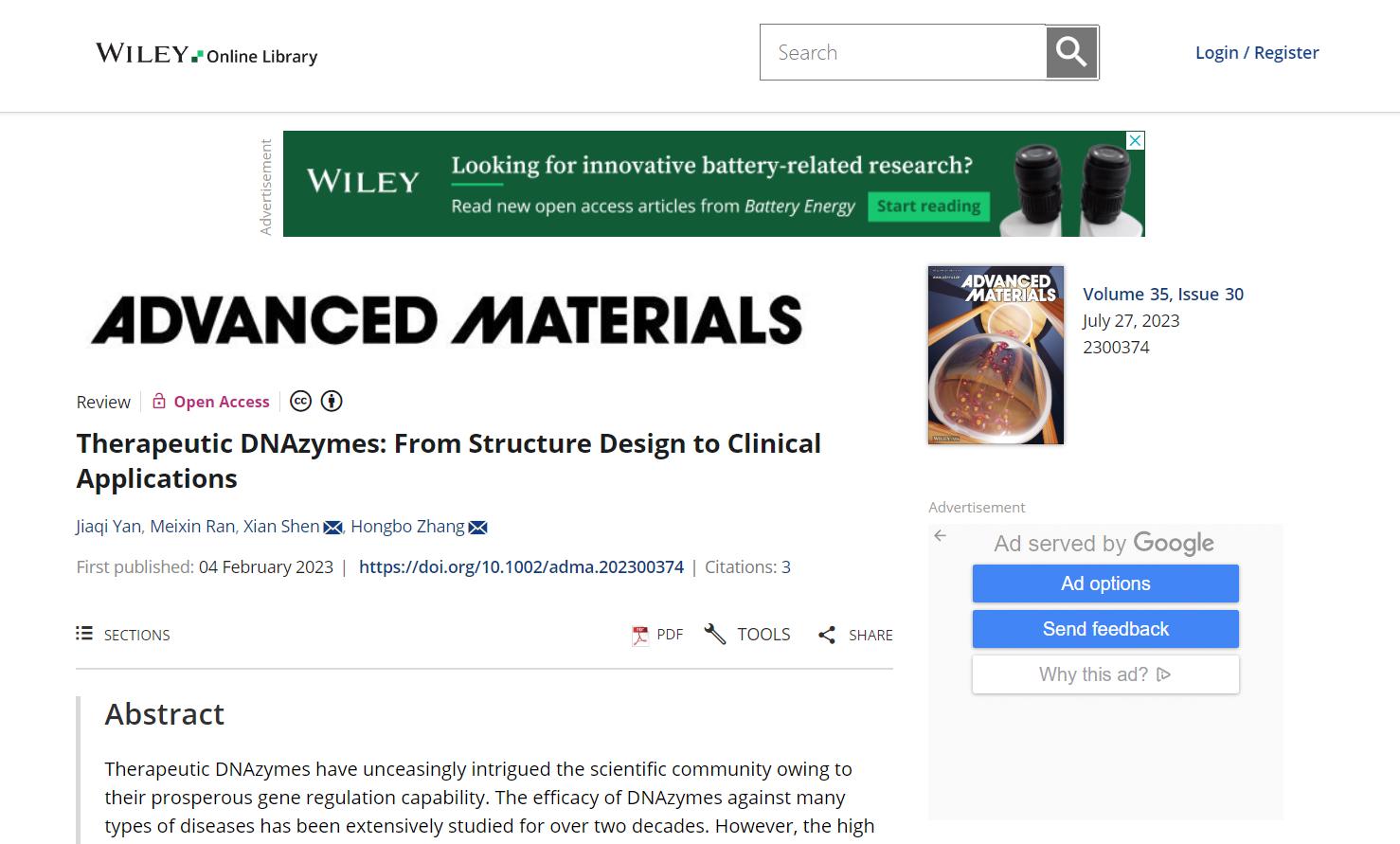 我院联合医学转化中心团队研究成果在《Advanced Materials》上发表