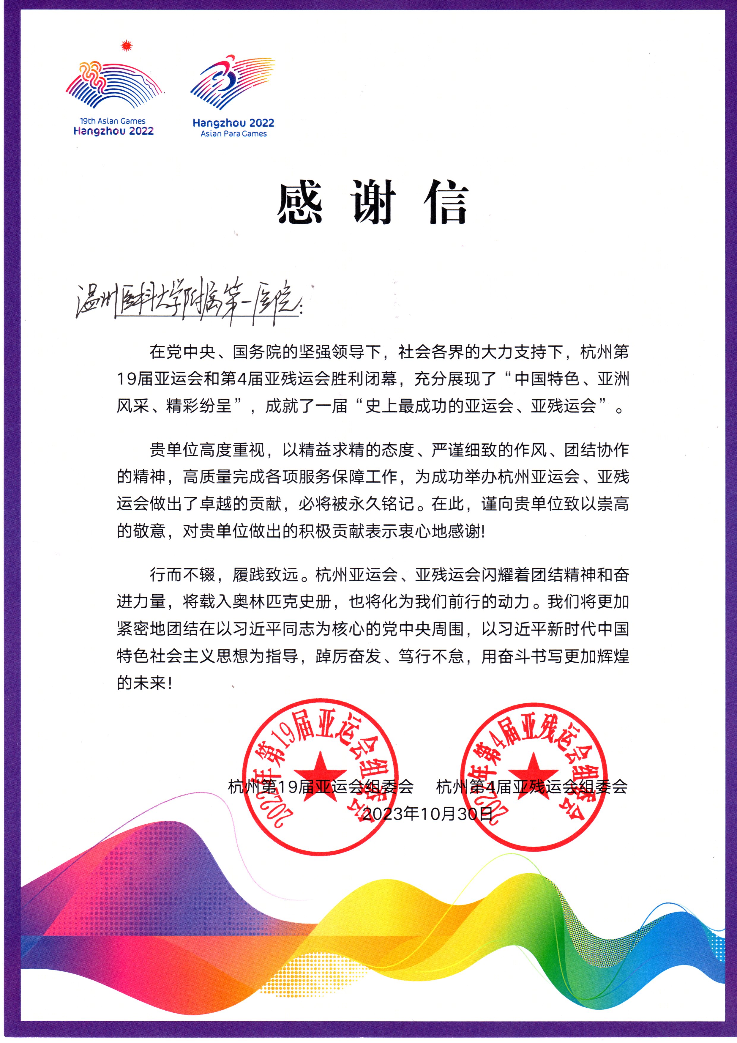 近日,杭州第19届亚运会组委会发来感谢信,向我院致以崇高的敬意,对我院做出的积极贡献表示衷心感谢。