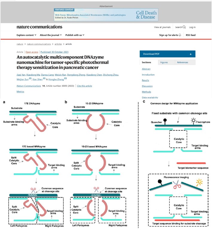 近日,我院联合医学转化中心张宏博研究团队,以Article的形式,在《Nature Communications》(IF=16.6)发表题为“An autocatalytic multicomponent DNAzyme nanomachine for tumor-specific photothermal therapy sensitization in pancreatic cancer”的研究成果。本研究构建了一种纳米机器,该纳米机器以DSPE-PEG-RGD胶束制备DSPE疏水核心,以负载光热疗法(PTT)染料IR780和钙外排泵抑制剂姜黄素,将MNA酶分布到亲水性PEG层中,通过生物矿化与磷酸钙进行密封,并将RGD附着在PEG的外尾上,用于胰腺癌的靶向治疗。该研究在张宏博教授和沈贤教授带领下展开,张宏博研究员为通讯作者,沈贤教授为共同通讯作者。