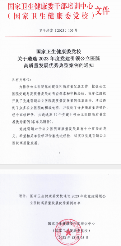近日,为积极推进党建引领公立医院高质量发展,挖掘公立医院党建与高质量发展的有益探索和积极经验,国家卫生健康委干部培训中心(国家卫生健康委党校)主办“2023年度党建引领公立医院高质量发展优秀典型案例”(以下简称“优秀案例”)征集活动,得到了全国各地各级公立医院的积极响应、参与。经专家组评估,活动共遴选出 50 个优秀典型案例,其中,我院党建工作案例《聚焦“不能腐”打造智慧监管系统》入选“优秀案例”。