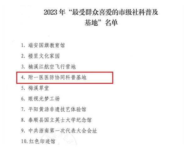 为进一步打造“云上科普”品牌,激发大众科普热情,2023年温州市社科联开展“社科基地云上看”活动。近日,经过网络投票和专家评审层层筛选,我院“附一医医防协同科普基地”入选2023年“最受群众喜爱的市级社科普及基地”名单,成为全市仅10家入选的科普基地之一。