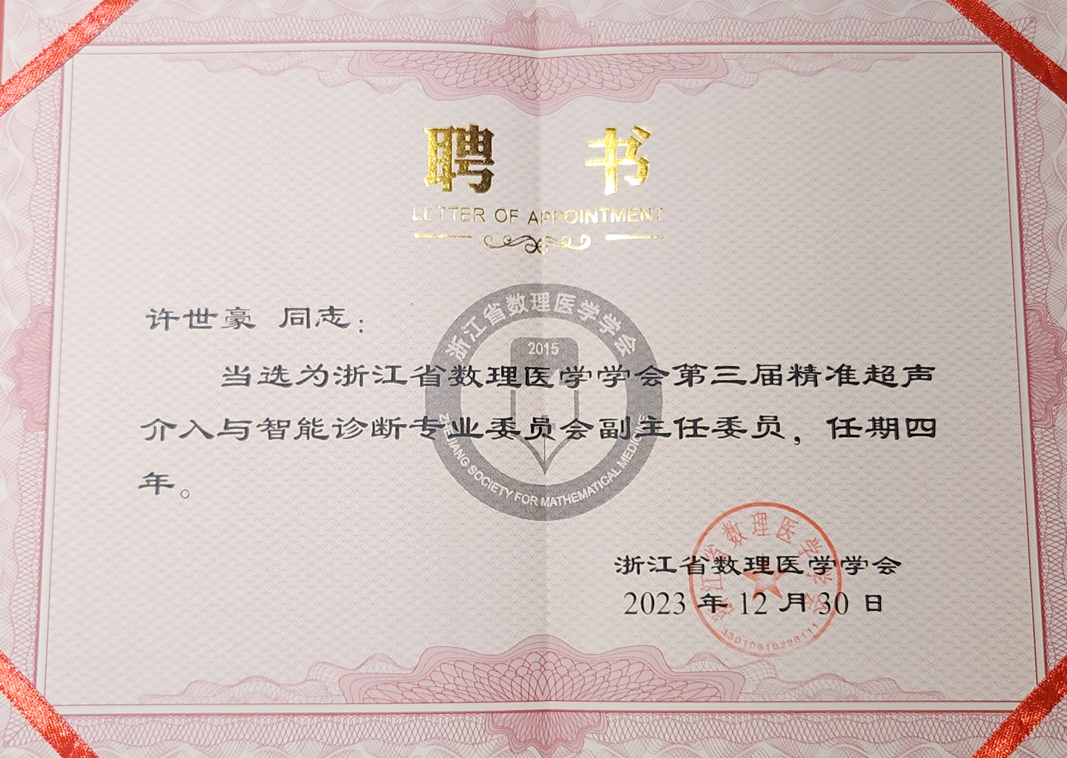 近日,浙江省数理医学学会换届选举大会举行,我院超声科副主任(主持工作)许世豪成功当选学会精准超声介入与智能诊断专业委员会副主任委员,并任周围血管及皮肤创面学组组长,为我院再添一个浙江省数理医学学会副主委单位。