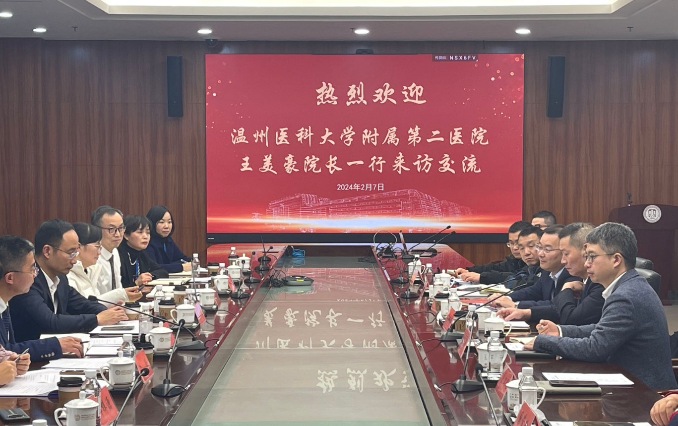 2月7日下午,温医大附二院院长王美豪、副院长蔡战英和采购相关职能处室负责人来院,开展专题交流采购工作。我院院长张纯武、副院长金献测出席会议,医学工程处、采购处、国有资产管理处等相关职能处室负责人参加交流。