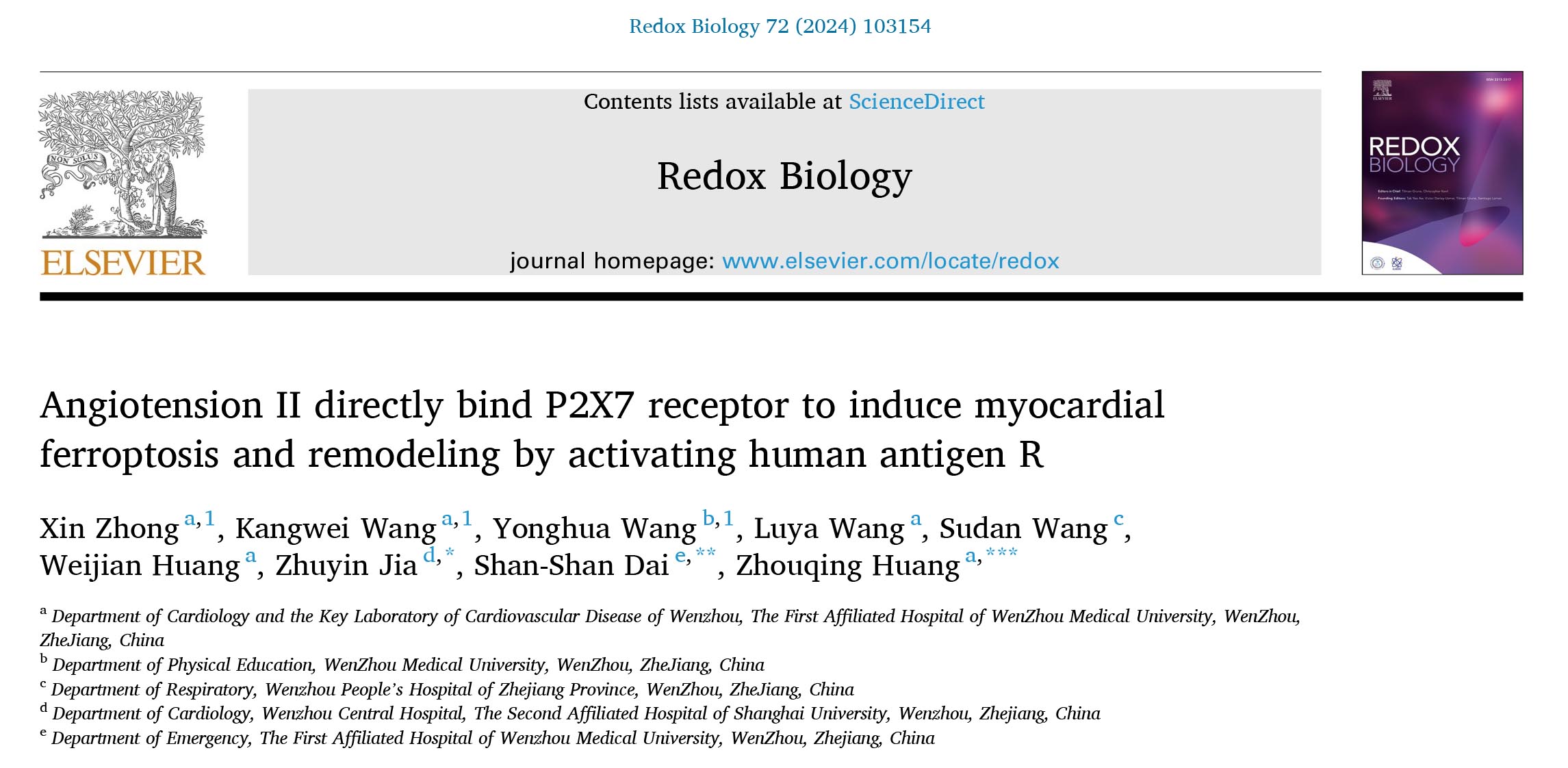 近日,我院心血管内科黄周青教授团队在国际权威期刊《Redox Biology》(IF=11.4,中科院1区TOP期刊),在线发表题为“Angiotension II directly bind P2X7 receptor to induce myocardial ferroptosis and remodeling by activating human antigen R”的研究论文,首次揭示并阐明了P2家族嘌呤能受体P2X7受体在血管紧张素II诱导的病理性心肌重构和铁死亡中的作用和机制。