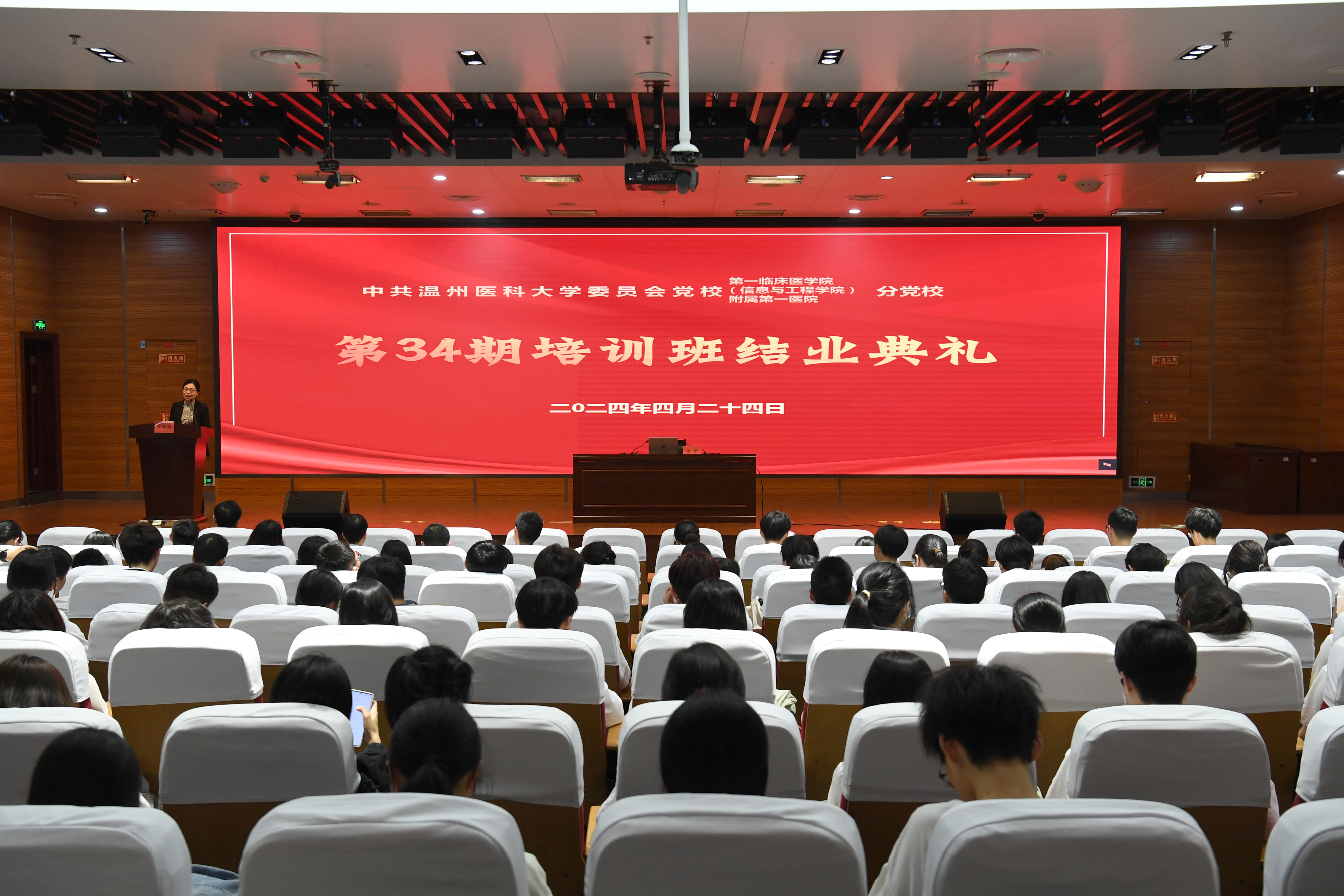 4月24日,中共温州医科大学委员会党校第一临床医学院(信息与工程学院)、附属第一医院分党校第三十四期培训班结业典礼在新院学术报告厅举行,来自各附属医院、学院及机关党委、基础医学院、康复医学院的1300余名入党积极分子、发展对象和预备党员以线上线下方式参会。