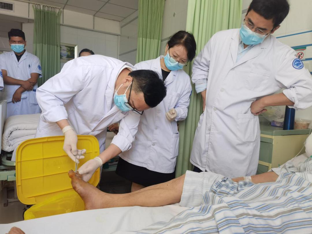 多学科糖尿病足病“小组团”援疆团队由我院内分泌科主任朱虹担任队长,带领血管外科副主任(主持)黄景勇、骨科周海波副主任医师,组成多学科糖尿病足病诊治团队。我院诊治团队到达阿克苏地区第一人民医院后,便立即深入内分泌科、血管外科、骨科等科室,了解糖尿病足病患者病情、诊疗过程,对疑难、危重患者进行多学科会诊,并结合医院及患者疾病特点制定精细的治疗方案与阿克苏地区医疗条件、医院学科建设、患者疾病特点等情况,制定多学科糖尿病足病诊治流程,助力医院多学科糖尿病足诊疗团队建设。