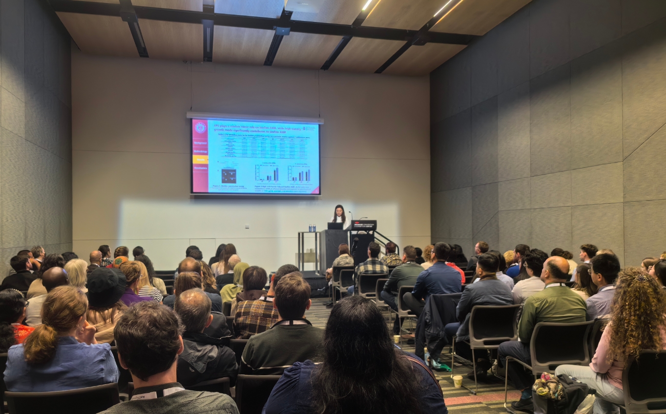 周铁丽团队此次在会议上进行了1篇口头汇报和1篇壁报展示,内容分别为《Cell metabolic repression as a key mechanism underpinning antimicrobial resistance of staphylococcal biofilms》和《Study on effects and mechanisms of type II secretion system secreted protein PulA on the virulence of Klebsiella pneumoniae》。团队分享了临床葡萄球菌生物膜感染对抗菌药物高度耐药性的关键机制研究,及II型分泌系统分泌的蛋白PulA在肺炎克雷伯菌致病过程中发挥重要作用的体内外研究,为临床病原菌感染的防治策略提供了新的思路。