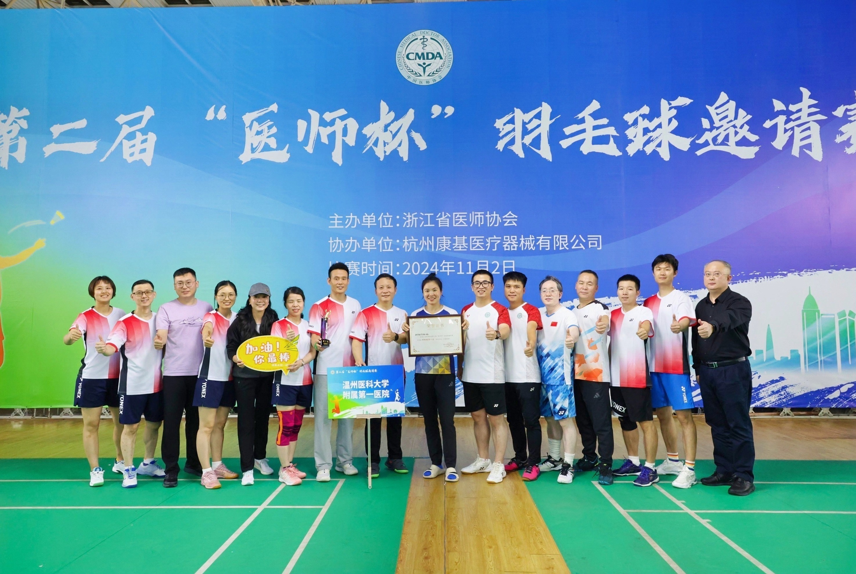 11月2日,由浙江省医师协会主办的“医师杯”羽毛球邀请赛在温州举行,来自省内各大医院,包括浙大一院、浙大二院、邵逸夫医院、省人民医院、温医大附二院与我院在内的10家单位组队参赛。经过激烈的赛事角逐,我院再次蝉联“医师杯”羽毛球邀请赛团体冠军,同时荣获最佳组织奖。