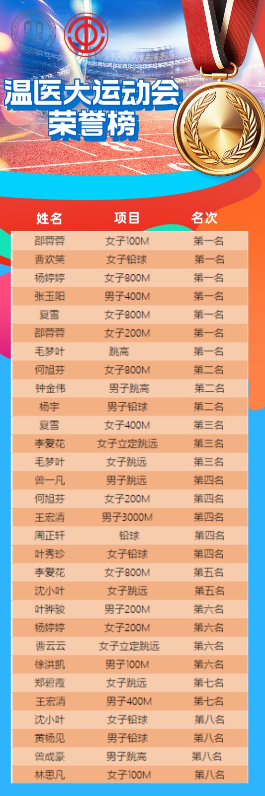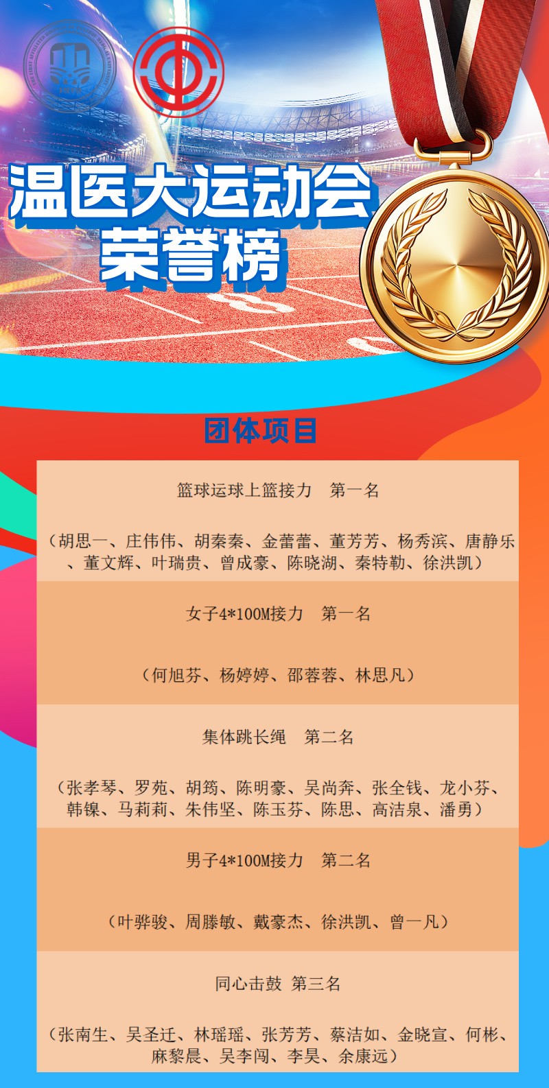 近日,在温州医科大学第五十届校运会上,我院68位运动健将奋勇拼搏、团结协作,以7枚个人金牌,2个团体冠军,团体总分231分的好成绩,在27家参赛队伍中脱颖而出,获得教工甲组冠军和体育道德风尚奖。