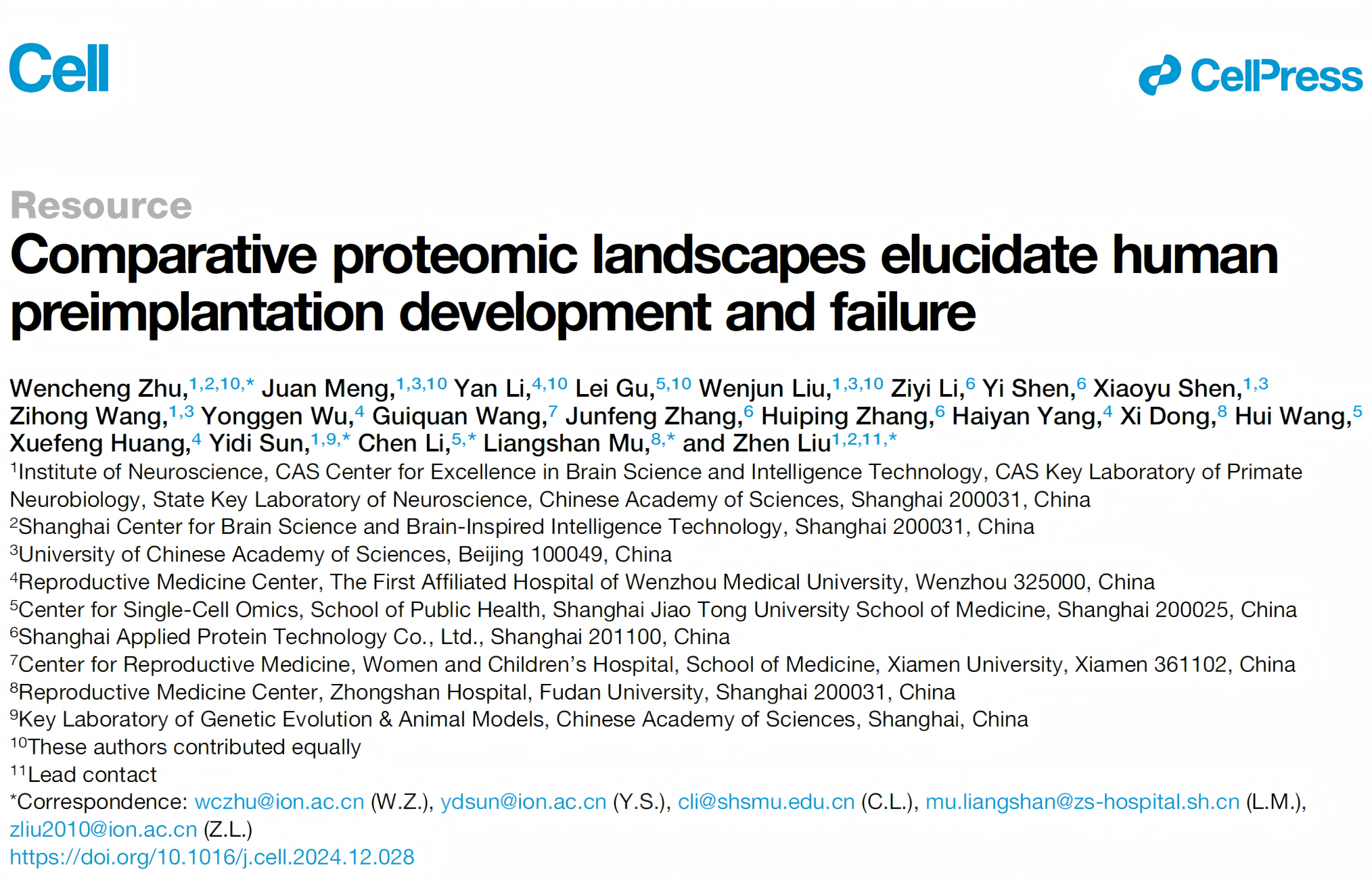 2025年1月23日,中国科学院脑智卓越中心/上海脑科学与类脑研究中心刘真、孙怡迪、朱文成,复旦大学附属中山医院生殖医学中心木良善,以及上海交通大学医学院李辰合作在国际学术期刊《Cell》在线发表了题为《Comparative proteomic landscapes elucidate human preimplantation development and failure》的研究论文。在这项工作中,研究团队优化了此前开发的超灵敏蛋白质组学技术体系,并通过低投入的样本描绘了人类和小鼠着床前胚胎的深度蛋白质组景观图谱。团队结合跨物种比较和多组学整合分析,系统性地解读了哺乳动物早期胚胎发育的过程,并围绕临床上常见的低质量胚胎的形成进行了单胚胎蛋白质组分析。