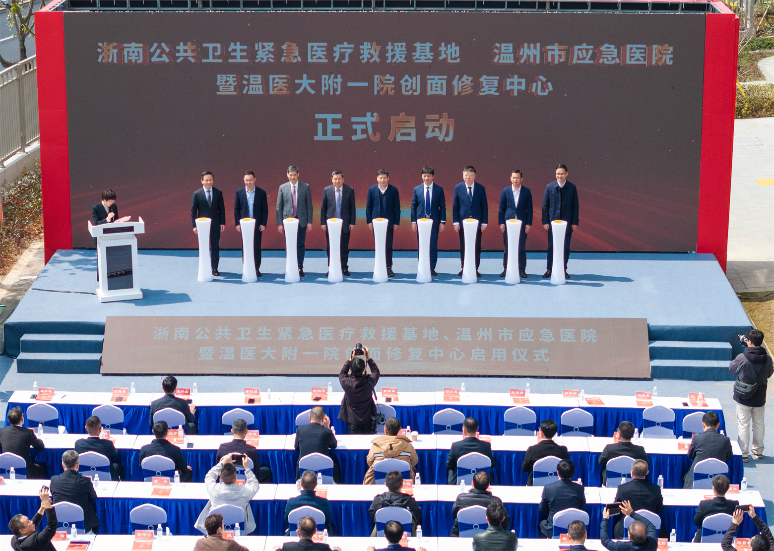 3月16日,浙南公共卫生紧急医疗救援基地、温州市应急医院暨温医大附一院创面修复中心正式启用。浙江省卫生健康委党委委员、副主任俞新乐,温州市政协副主席、瓯海区委书记曾瑞华,中国工程院院士、解放军总医院医学创新研究部创伤修复与组织再生研究中心主任付小兵,中国工程院院士、温州医科大学校长李校堃,中国工程院院士、陆军特色医学中心战伤前沿技术研究室主任、创伤、烧伤与复合伤国家重点实验室主任蒋建新,加拿大健康科学院院士、温州医科大学学术副校长宋伟宏,浙江省卫生健康委医疗应急处处长罗华标,温州市卫生健康委党委书记、主任王晓春,温州市国动办主任池晓荣,温州医科大学副校长、温医大附一院党委书记沈贤,以及省市有关部门领导,国内创面修复领域知名专家,医疗系统代表,医院领导班子成员、相关临床科室、职能处室负责人等参加活动。