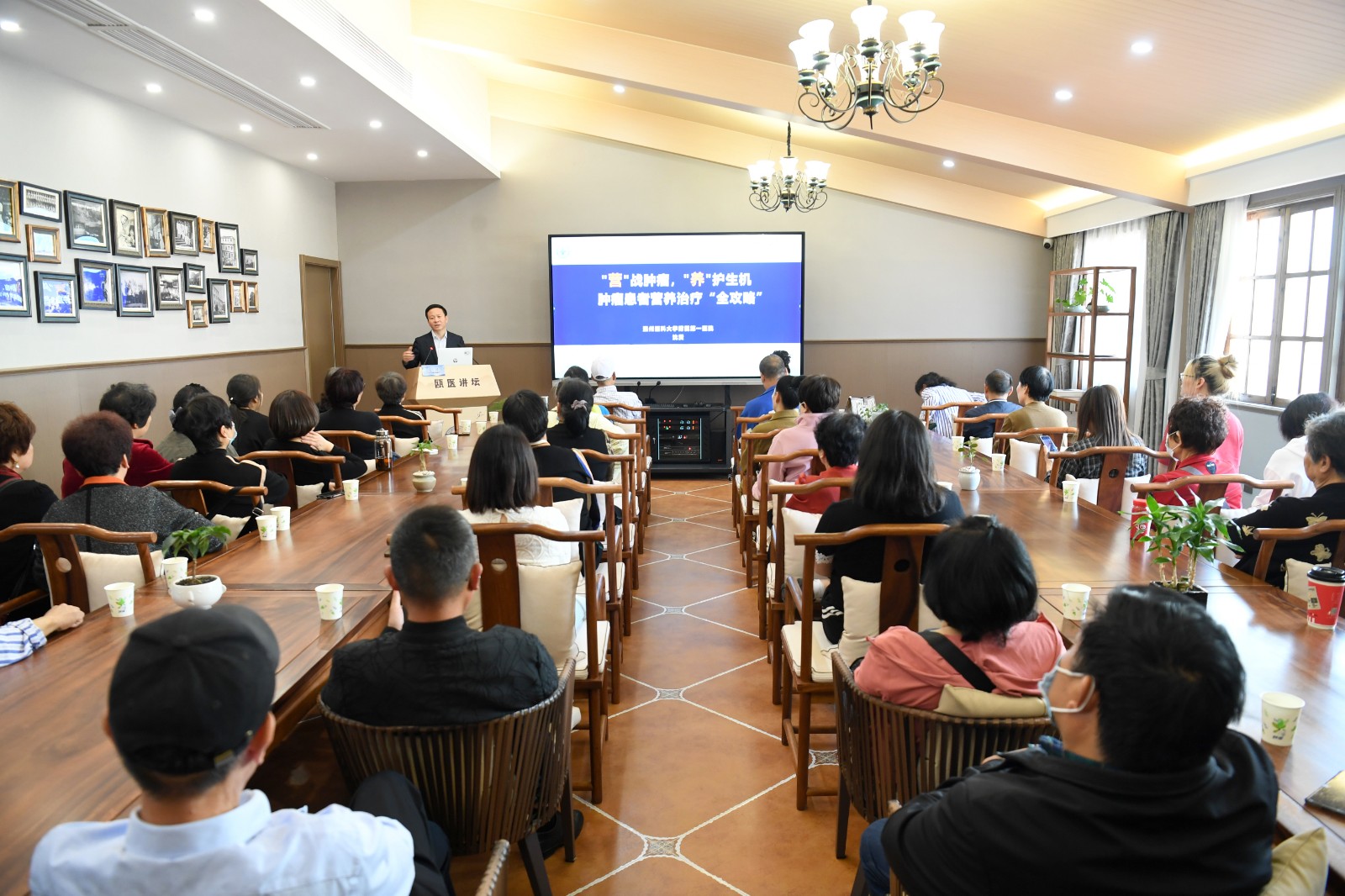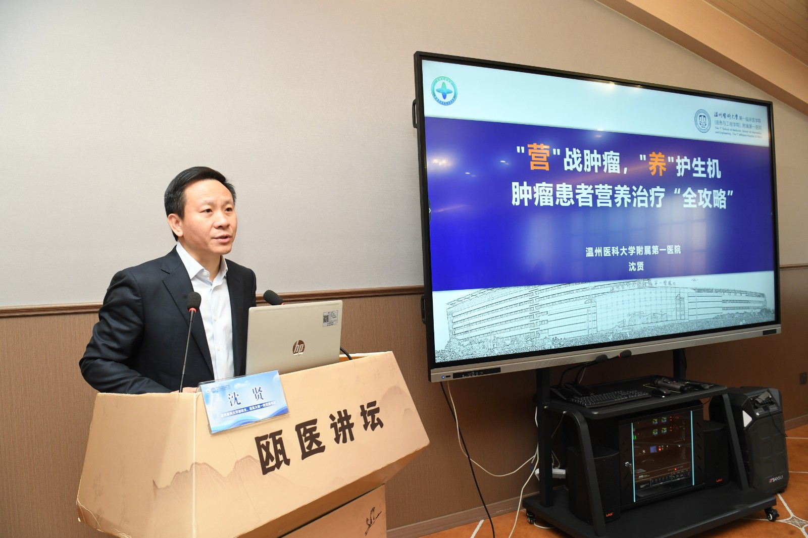 温州医科大学副校长、温医大附一院党委书记、胃肠肿瘤和营养专家沈贤教授以《“营”战肿瘤,“养”护生机——肿瘤患者营养治疗“全攻略”》为题,在公园路瓯医溯宗展陈馆为市民朋友们开展科普讲座。他以贴近日常生活的实际案例,用通俗易懂的语言、生动风趣的演示,从升级营养治疗理念、同步启动营养评估、建立科学营养认知等方面,详细阐述了肿瘤患者三级营养诊疗防线对病程周期营养全覆盖的助力作用。他强调,要以“我知你知”的深度协同、“全程管理”的防治链条、“全息发力”的生态潜能为依托,践行“肿瘤防治,赢在整合”的总体理念,推行“多学科协同诊治”实践,创建医患共治的肿瘤全周期管理体系,共同助力实现“健康中国2030”战略目标。