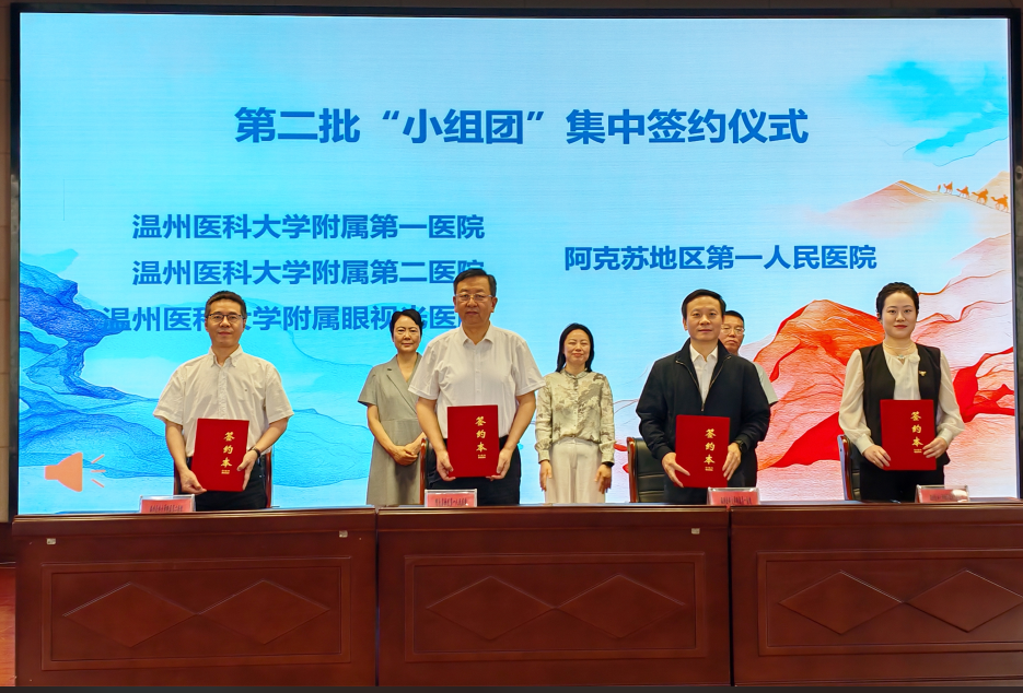 6月13日,2025年浙江医疗“小组团”援疆工作推进会暨第二批“小组团”集中签约仪式在新疆阿克苏地区第一人民医院举行。温州医科大学副校长、我院党委书记沈贤参加会议,体现了我院对医疗援疆工作的高度重视,也彰显了我院在助力边疆医疗事业高质量发展中的积极作为与责任担当,为推动优质医疗资源向边疆纵深辐射注入了强劲动力。