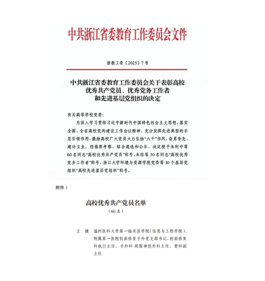 近日,中共浙江省委教育工作委员会发布《关于表彰高校优秀共产党员、优秀党务工作者和先进基层党组织的决定》(浙教工委〔2025〕7号)文件,我院王健教授获评“浙江省高校优秀共产党员”。