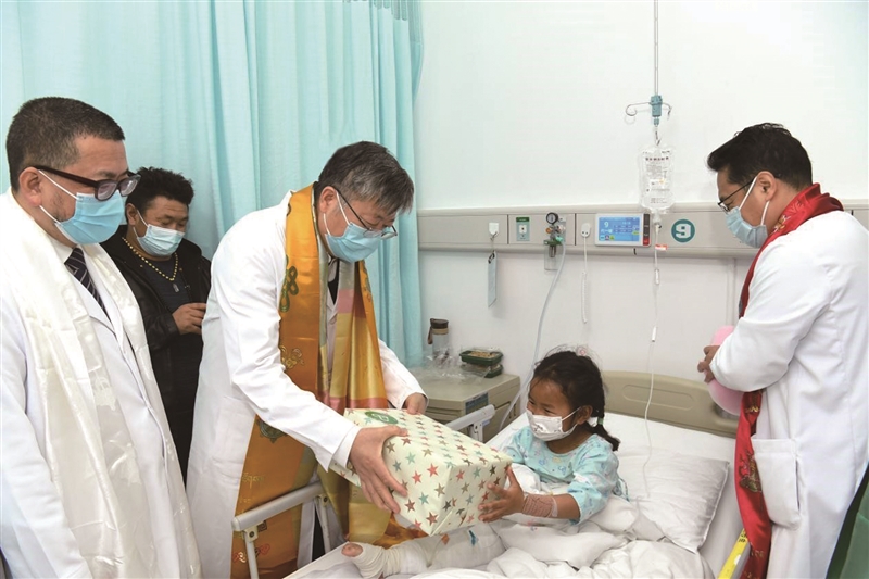 温都讯 1月22日,“肤生工程”发起人、中国工程院院士、温医大校长李校?姨酵?代吉拉增,为她送上慰问品。这位6年前烫伤的青海玉树州拉吾尕藏族小学7岁藏族女孩开心地笑了。温医大研究生院院长、药学院党委书记肖健,温医大附一院院长潘景业,温医大办公室副主任、“肤生工程”秘书长王小尚等参与慰问。