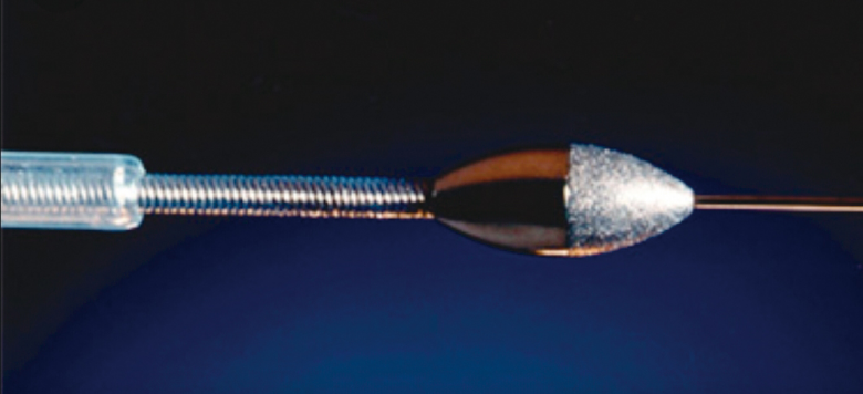 冠脉旋磨术就是将直径为1.25毫米~2.2毫米的金刚钻磨头,在导丝引导下进入患者冠状动脉,加速到每分钟十多万转的速度打磨血管通常的“壁垒”,从而将钙化斑块打磨成肉眼不可见的碎屑,是对付冠脉钙化病变的利器。