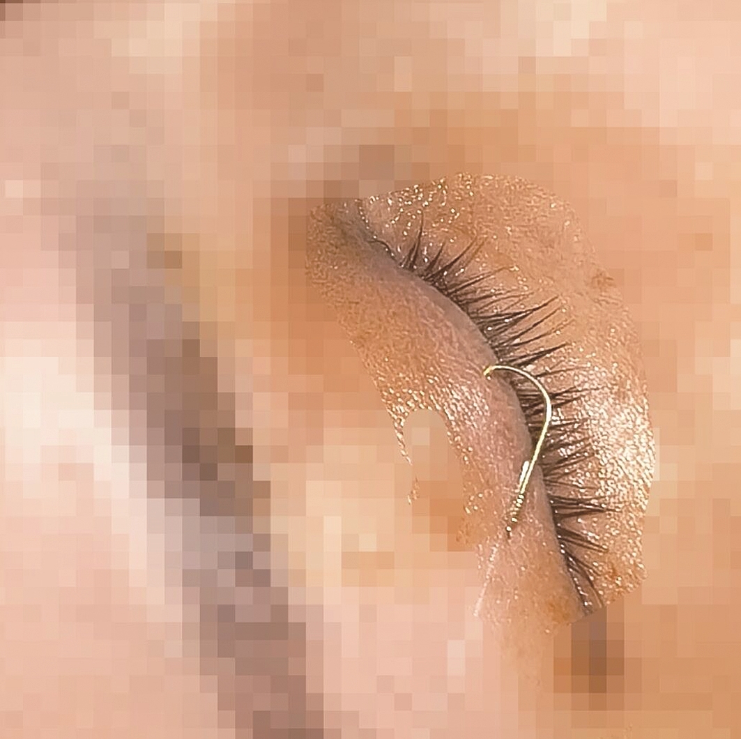 经过进一步检查后,潘建最终决定手术取出这枚鱼钩。首先在鱼钩刺入处周围眼睑皮肤进行局部麻醉,然后沿着鱼钩刺入的位置横行切开一道小口,将鱼钩与眼睑皮下组织小心分离,再完整取出这只鱼钩,经过充分灭菌消毒创口后,最后对眼皮进行缝合(1针)。