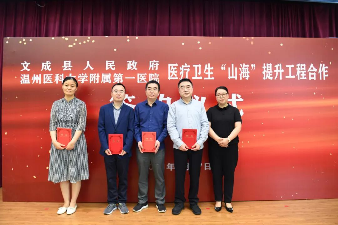温医大附一院洪万东、俞振飞、周静、李又成等四位专家分别受聘为文成县人民医院内镜中心、眼科、产科、放射科科室主任,他们将充分发挥专业所长,对学科进行全方位帮扶。