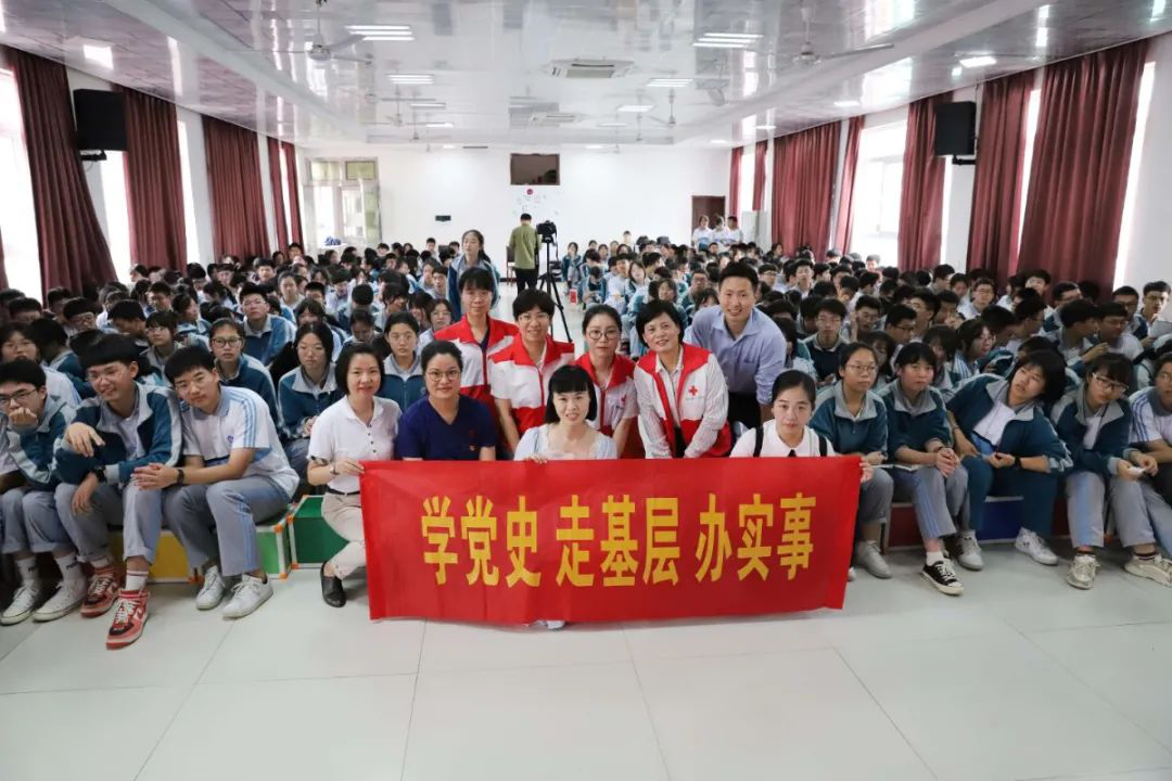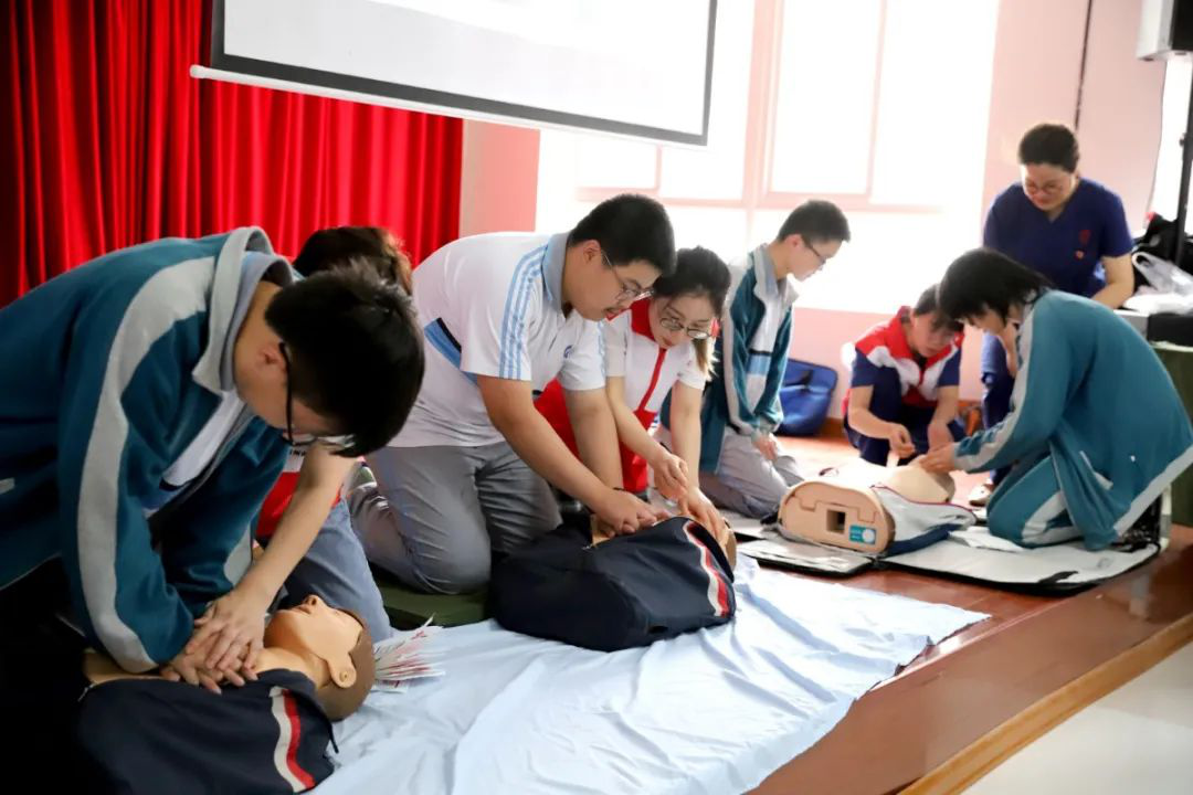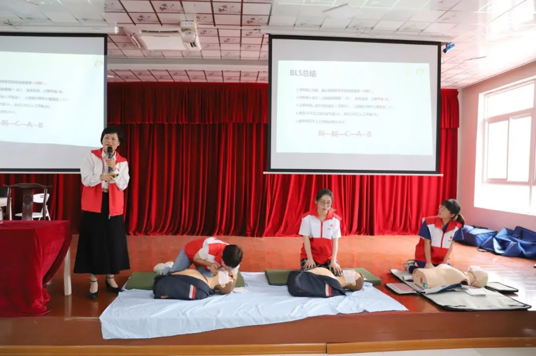 在文成二高的另一会场,门诊总护士长林碎钗带来一场精彩的“急救知识培训”。简单的“叫叫CAB”让人易懂易学。现场演练环节,学生们踊跃参加,老师们手把手教授心肺复苏技能,让他们在模拟人身上切身感受急救过程。内科总护士长郑秀云则带来“疫无反顾,责任担当”讲座,讲述了她在武汉抗疫时的经历。身穿4件防护每日工作10余小时,在供氧系统损坏的情况徒手搬着氧气筒送到每一个病房等一幕幕场景犹如电影画面重现在学生眼前,他们被这些饱含真情的抗疫故事深深地感动着,也对抗疫英雄们无畏奔赴的精神肃然起敬。