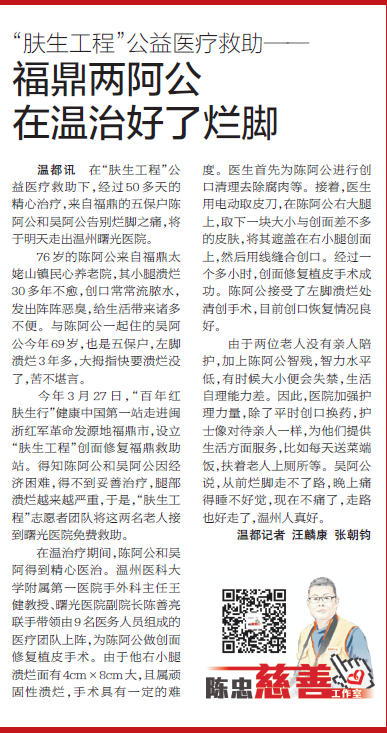 【温州都市报】“肤生工程”公益医疗救助―― 福鼎两阿公 在温治好了烂脚