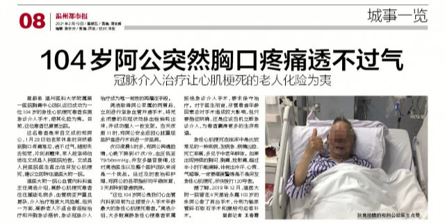 【掌上温州客户端】104岁阿公突然胸口疼痛透不过气 冠脉介入治疗让心肌梗死的老人化险为夷