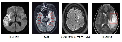 当然,这只是比较典型的案例,临床上可能会有一些发作较少或症状较轻的患者的脑电放电通过头皮脑电图很难抓到,需要反复检查、进行长程的脑电图检查或颅内电极脑电图才能明确。其次,我们要进行头颅磁共振检查,因为磁共振可以帮助我们发现癫痫的病因。在癫痫患者的检查中,我们可以发现各种各样的结构性异常,除了小陈那样的海马硬化,还可以见到如下病变: