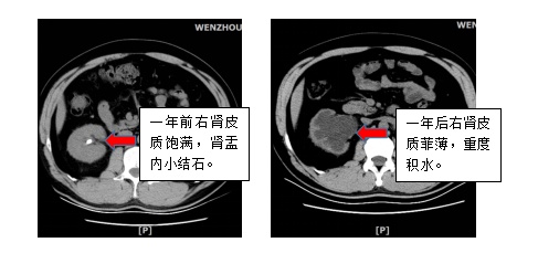 右肾结石移动到右输尿管,引起右输尿管梗阻,进而引起肾积水。而长时间的肾积水导致肾脏皮质变薄,最终导致单侧的肾脏功能丧失。