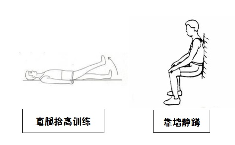 ②靠墙静蹲:适合年龄55岁以下或膝关节软骨情况尚可的人群,靠墙静蹲到大腿发酸即可,量力而为,一天做3次。(如果静蹲时或静蹲后出现膝关节前方疼痛的人,就不适合继续做这个动作了,选择直腿抬高训练即可)常用方法:股四头肌等长收缩训练,直腿抬高加强股四头肌训练,臀部肌肉训练,静蹲训练,抗阻力训练。