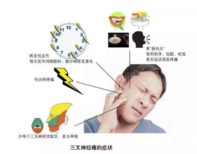 3. 吃饭、洗脸、刷牙、喝凉水,甚至不小心摸了一下脸的某一区域,都可诱发疼痛发作。