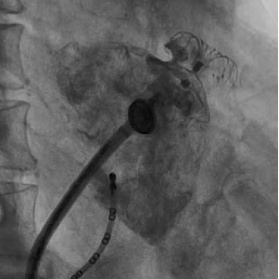 一个月后,肖方毅医师在心腔内超声和三维电解剖标测系统指导下为蔡老伯成功实行房颤射频消融联合左心耳封堵术。这是目前最新的技术,整个消融过程因为有心腔内超声的指引,无需任何射线,直视下精准构建左房模型,精准消融(图1)。消融后肖方毅医师用自己创立的“FLAVOR”术式,在腔内超声指导下顺利植入左心耳封堵器(图2,图3),避免了以往术中需要做经食道心超检查的痛苦。