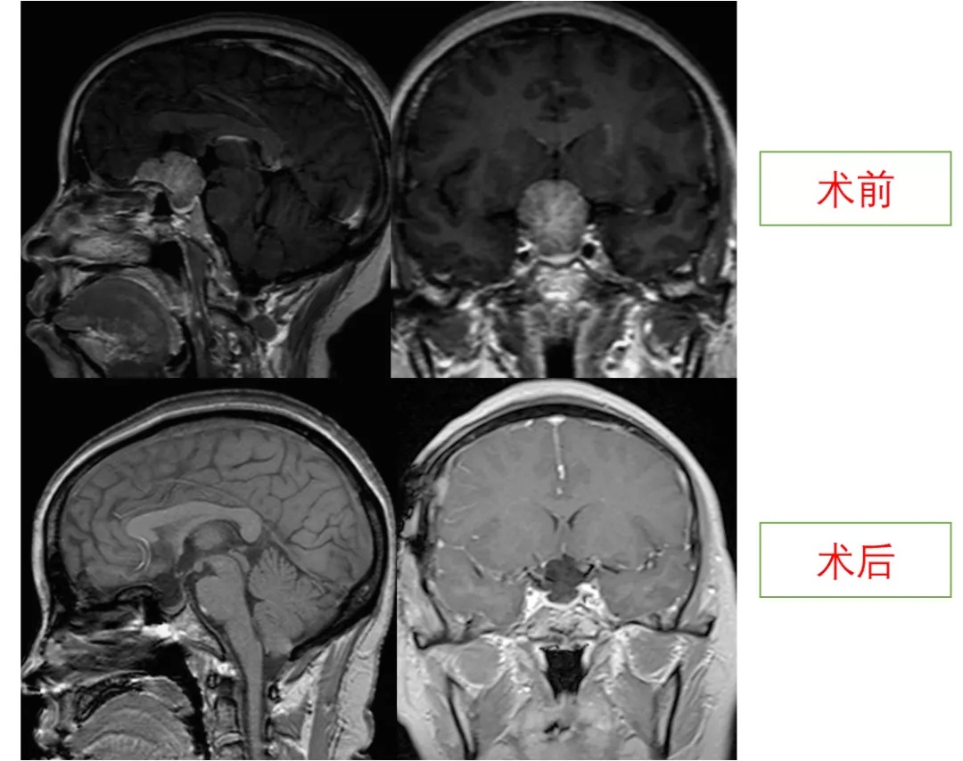 在经过手术后,患者双眼视力好转,右眼的恢复更加明显。这也与术前左眼视力更差,术中看到肿瘤与左侧视神经粘连较紧密相关。复查头颅磁共振,显示肿瘤已完全切除。