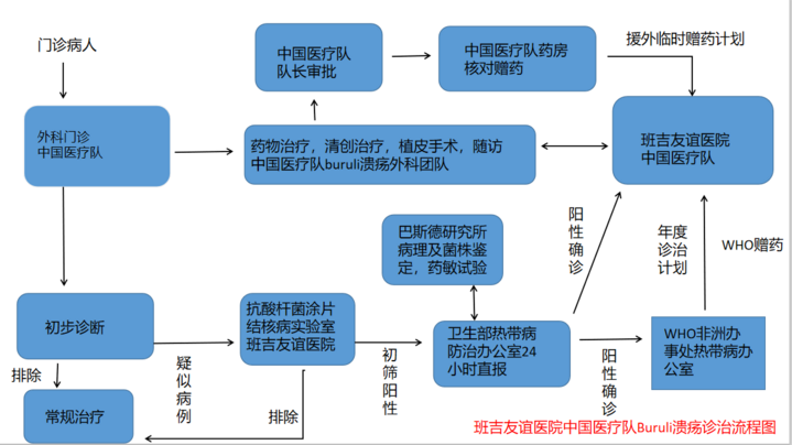 “在缺医少药的情况下,我将病人的情况发回本院,中医科袁拯忠、烧伤科罗旭、皮肤科孙莹等医生纷纷出谋划策。”暨玲医生利用医疗队物资和非洲当地植物制作成药膏免费赠送给患者治疗,大部分患者病情有了明显好转,但是仍有一些病人无法得到治愈。大家集思广益并通过查阅大量文献,对比图片资料,和WHO热带病专家邮件沟通,最终确认一些无法治愈病人可能患有:Buruli溃疡(布如里氏溃疡)。