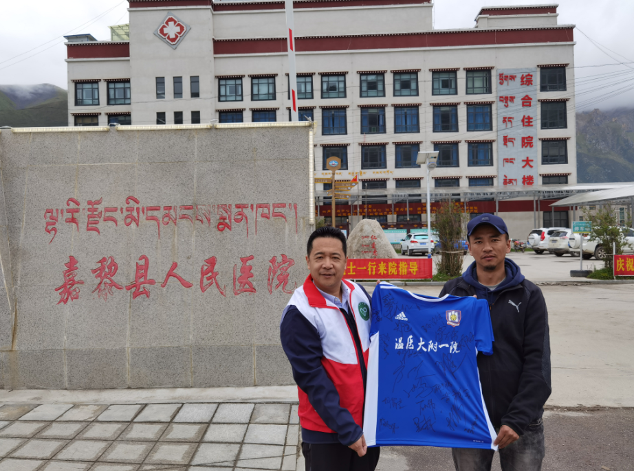 得知格桑平措酷爱足球,王健代表该院足球俱乐部赠送格桑平措一件特殊的球衣,上面印着“温医大附一院”“温医大附一院足球俱乐部”的LOGO,编号:4500。王健说,4500号代表着世界上海拔4500米,小小的一件球衣背后,是满满的藏汉一家亲的深情厚谊。温医大附一院骨科党支部还为两名嘉黎县患者捐赠了部分医疗费。