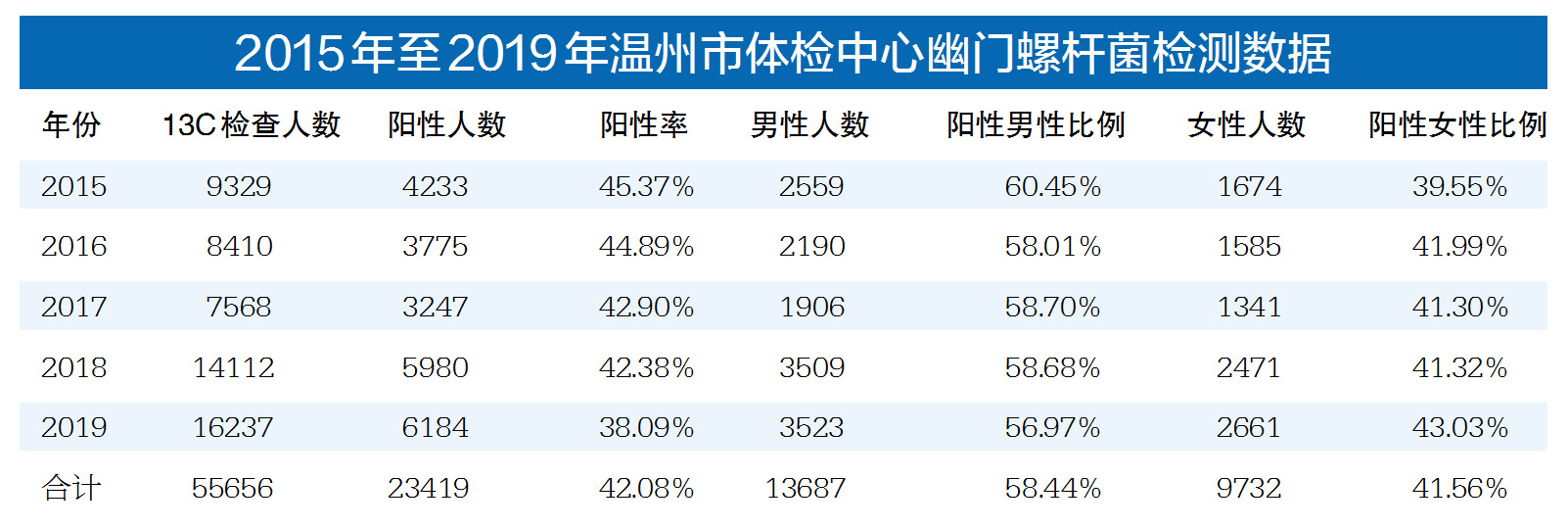 4月8日,记者从温州市体检中心获悉,从2015年至2019年,该中心共有55656人自愿进行幽门螺杆菌呼气采样检测,其中有23419人检测结果呈阳性(即测出幽门螺杆菌),检出比达42.08%。其中,男性感染者为13687人,占58.44%;女性感染者为9732人,占41.56%。