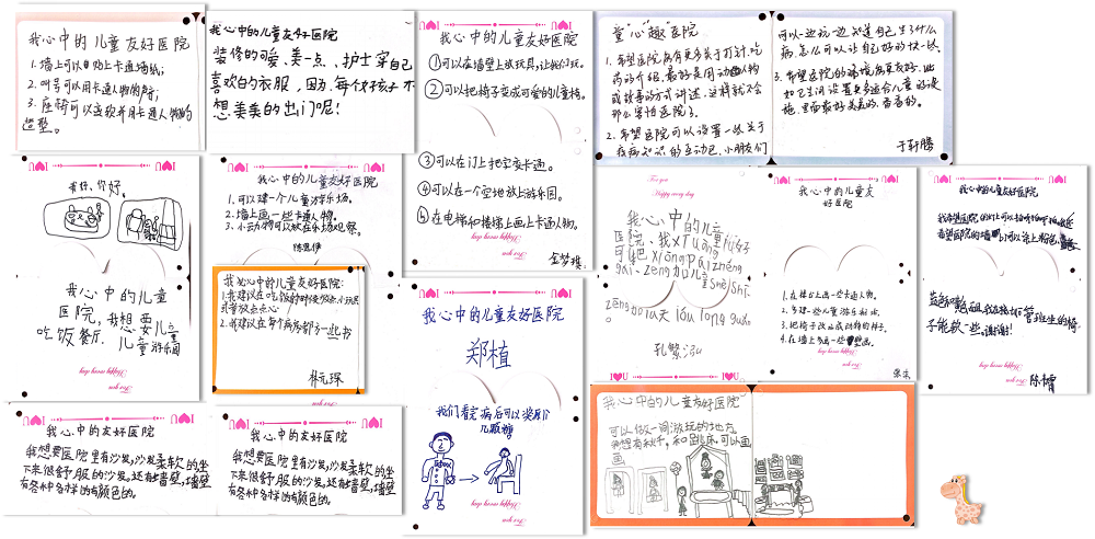 儿童观察的成员们还发挥了自己独特的想象力,绘制出了他们心目中的医院。他们不仅用色彩表达了对医护人员工作的赞美,也画出了对医院未来工作的期许。