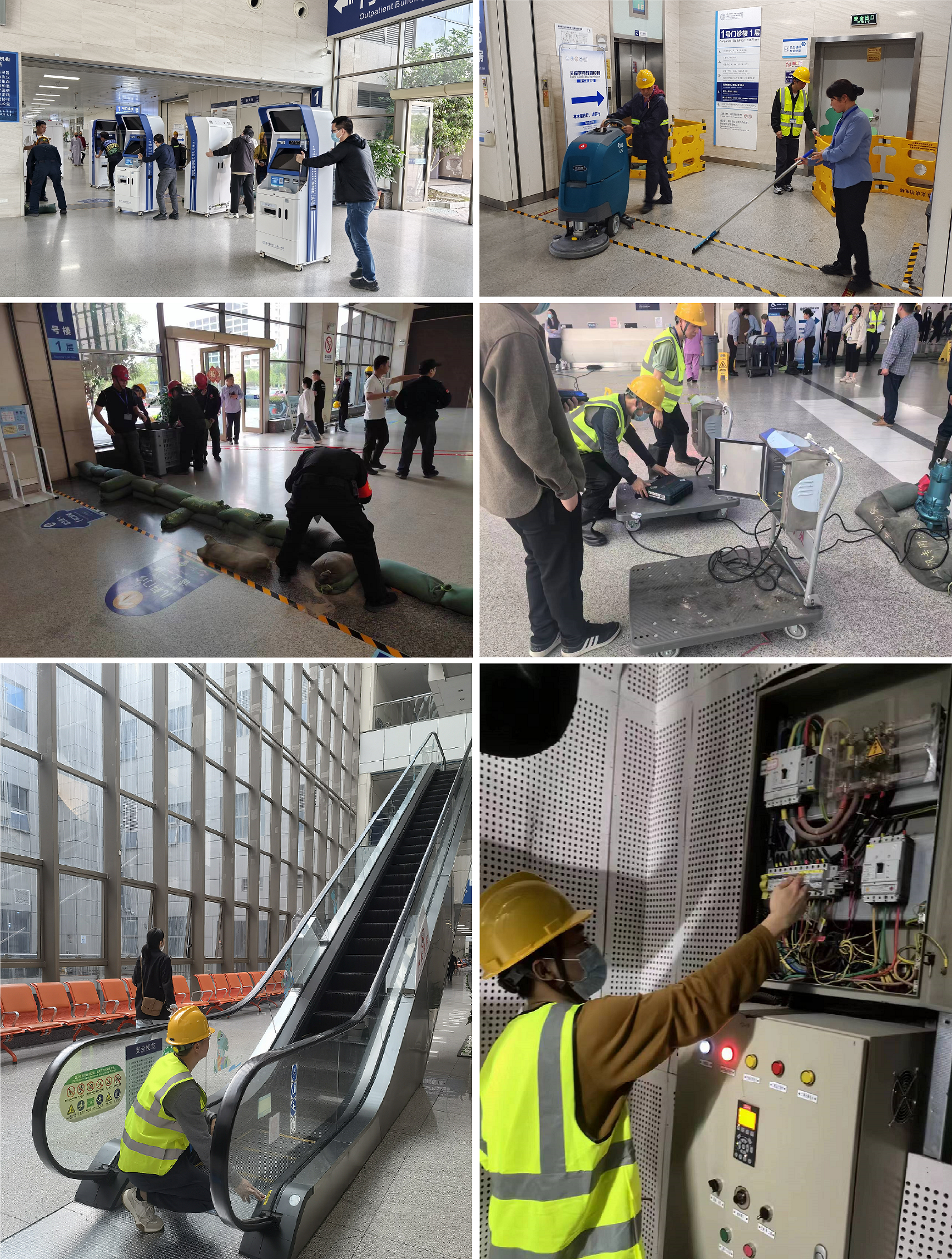 本次演练模拟暴雨环境,按照《台风、暴雨和低温雨雪等灾害性天气应急预案》采取措施进行抢险、救援。发现台风天气中雨水倒灌大厅,100呼叫中心接到警情后迅速上报,总务处立即启动响应措施,各部门单位集结并转移重要物资,设置临时挡水、排水系统,清理积水,恢复原状……环环相扣,依次演练应急预案中的各个项目流程,并顺利完成。
