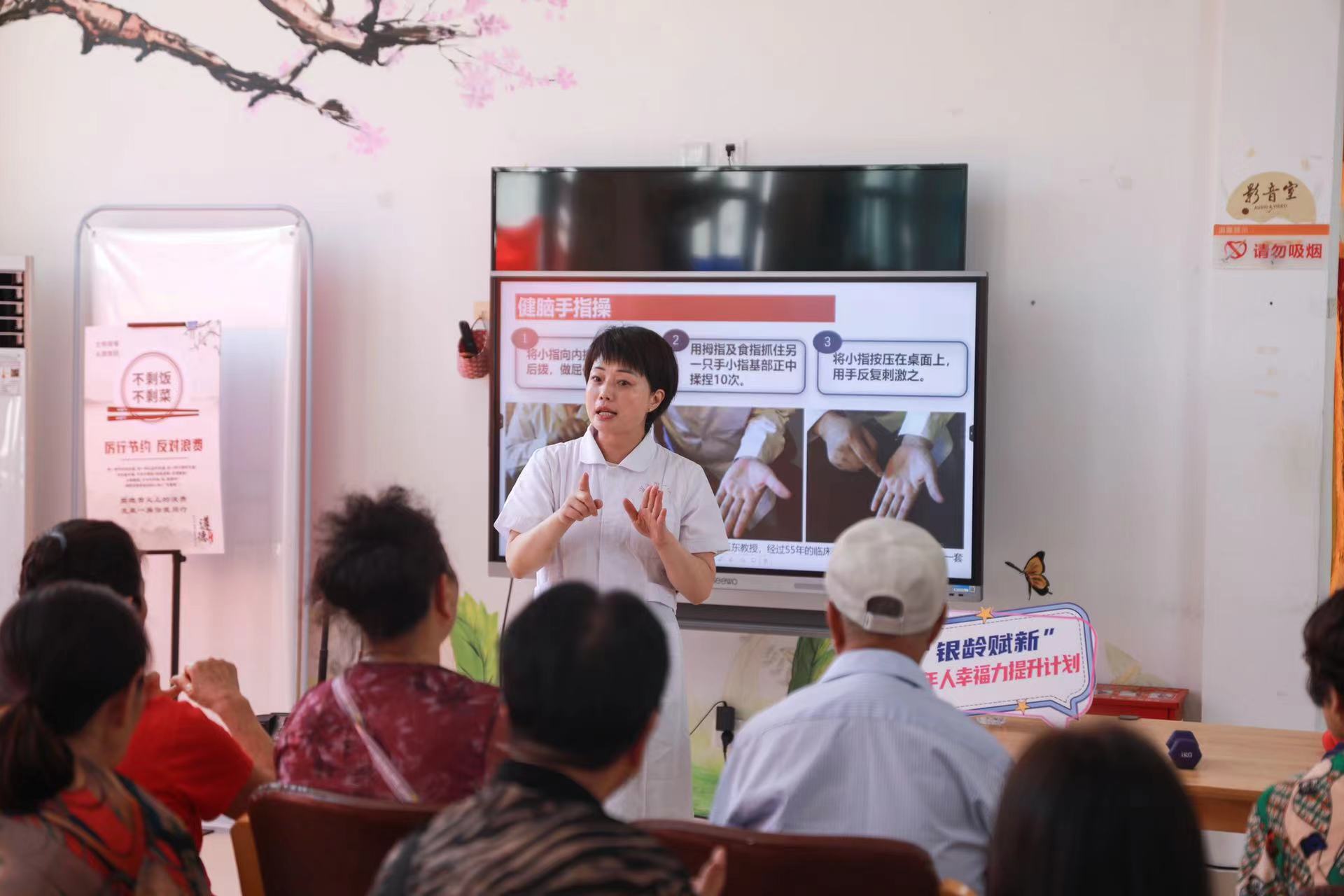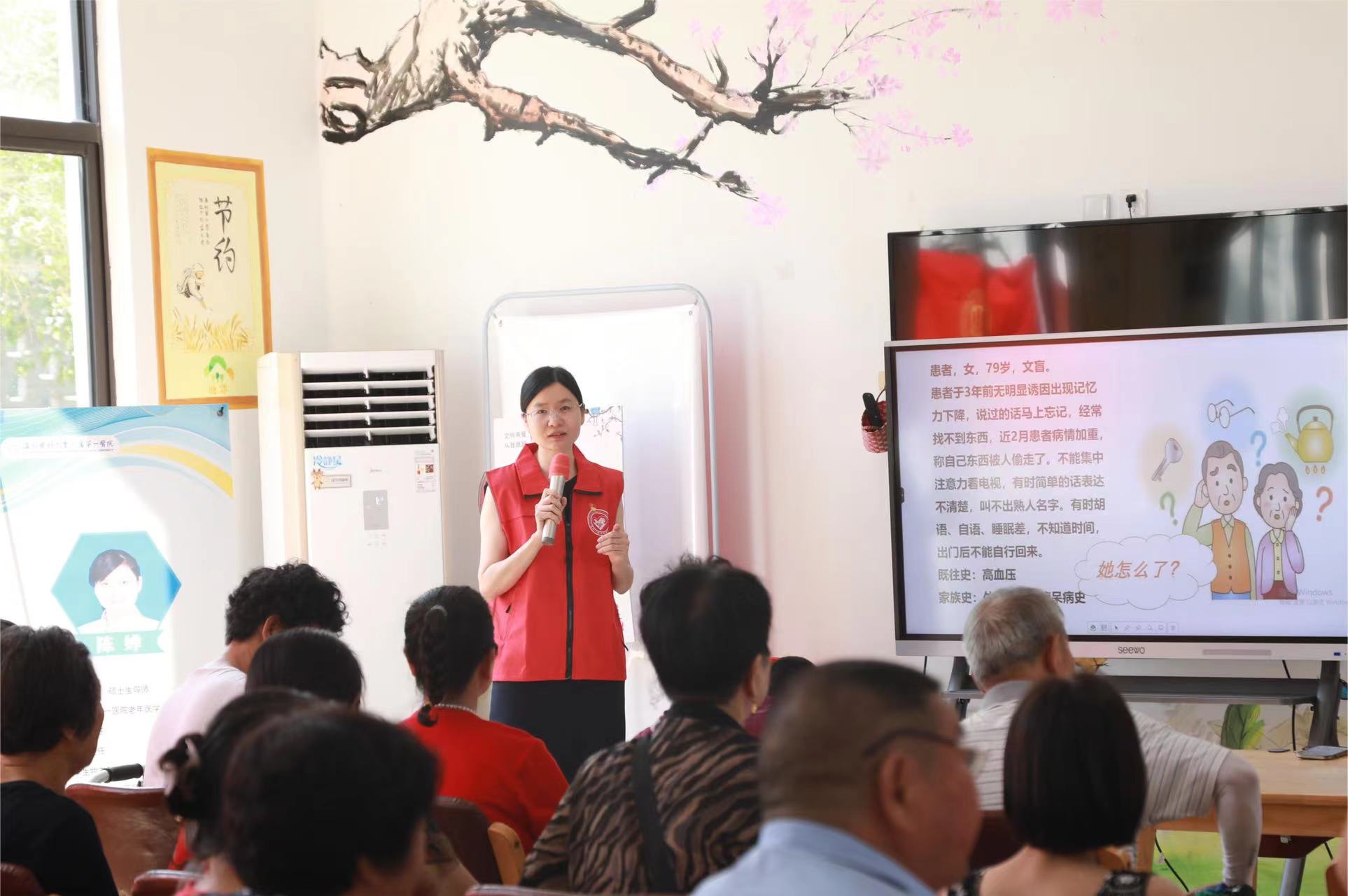 本次活动在七都街道睦邻养老服务中心举行,吸引了百余位老年居民参加。活动现场,我院老年医学科(干部保健)主任陈婵用温州话给居民科普了阿尔兹海默症的症状,老年医学科(干部保健)541病区护士长陈秀芳则带来了能够预防阿尔兹海默症的健脑手部操,老人们纷纷跟随学习,场面温馨有趣。