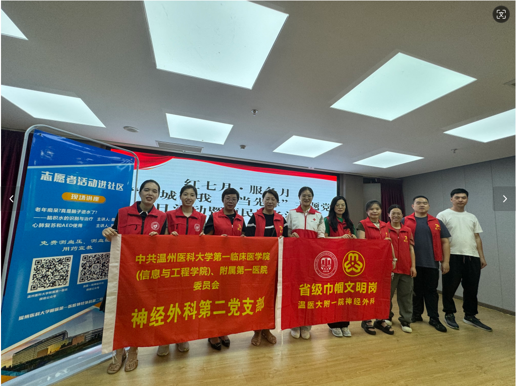 7月14日,神经外科第二党支部携手罗西社区党群服务中心,共同举办“红七月服务月”志愿者服务进社区活动。此次活动为当地居民提供了健康服务,包括免费测量血糖、血压,开展科普讲座,将健康关怀送到群众家门口。
