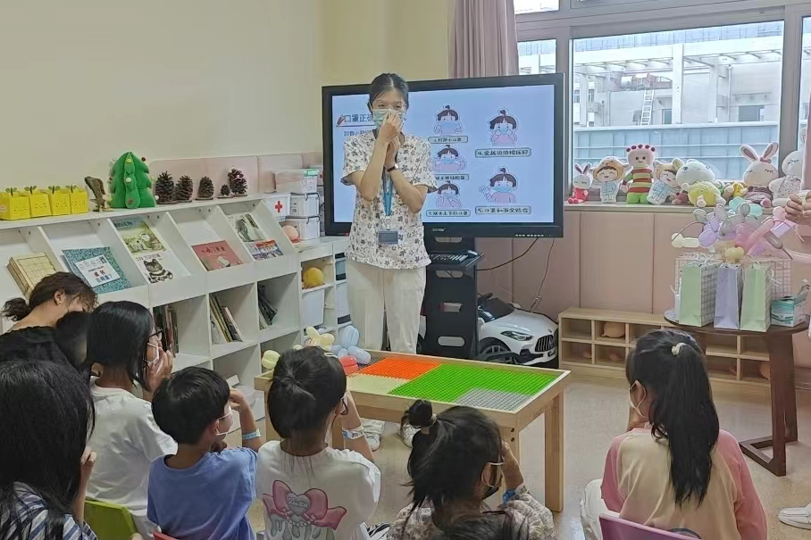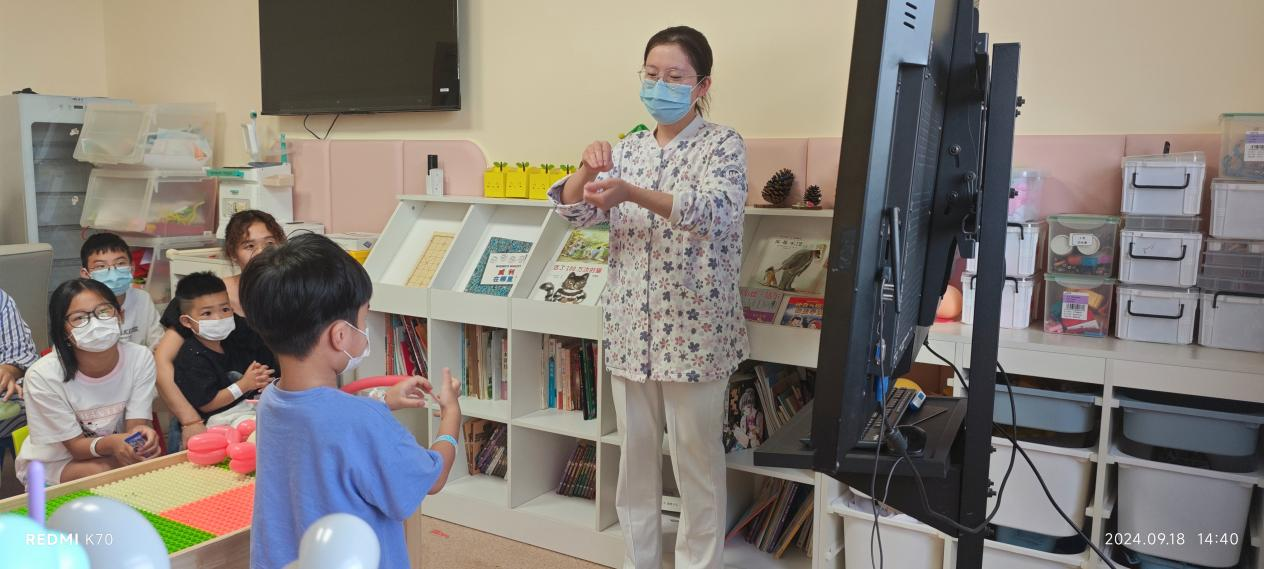 病区护士陈小君通过生动的示范和详细的讲解,帮助小朋友们学会如何正确佩戴口罩。互动过程中,陈老师还向小朋友们介绍了其他重要的疫情防控知识,让孩子们在轻松愉快的氛围中学习和掌握知识,养成良好的卫生习惯。