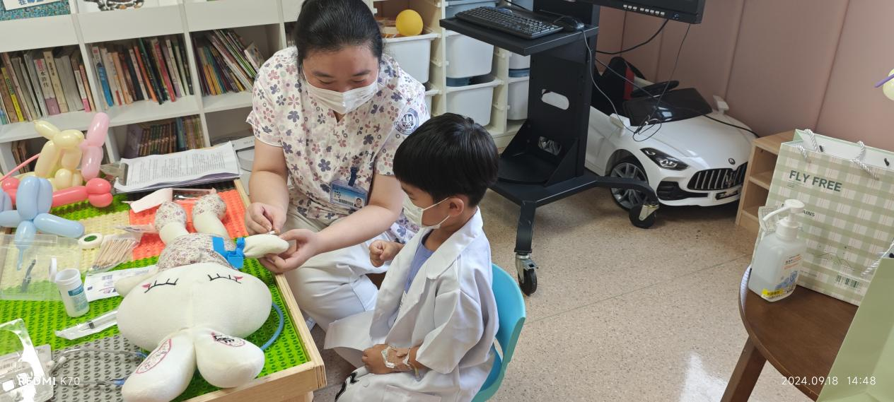 活动的重头戏——“我是小医生”情景模拟活动由陈青思老师带领孩子们进行医护角色扮演,通过模拟打留置针的场景,让孩子们亲身体验以减少对医疗过程的恐惧。