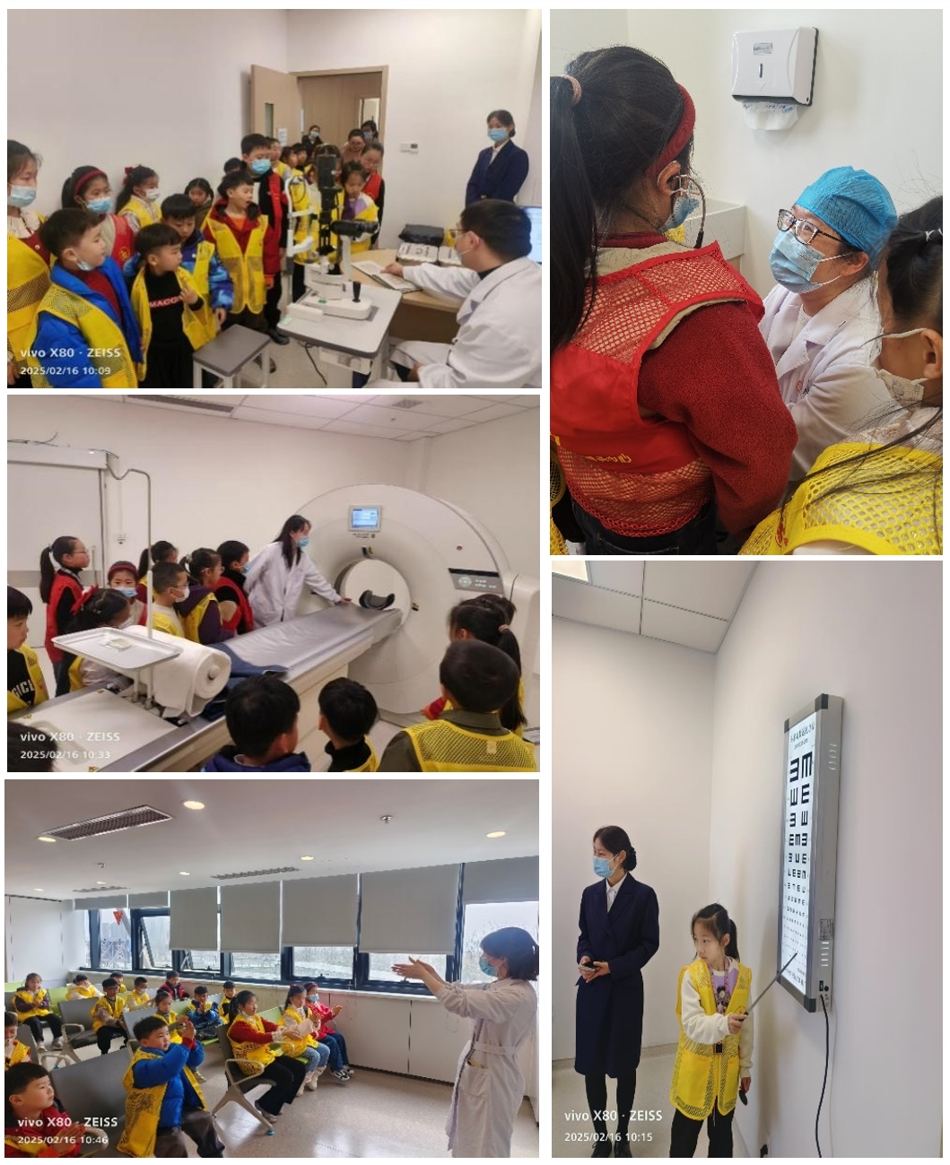 在医疗保健中心巾帼文明岗医护团队的带领下,孩子们通过“全流程健康管理体验课程”,以"小小医生"身份参与基础体检和专科检查的各个互动环节,包括测量身高体重、戴上听诊器感受心跳律动、操作视力检测设备开展"工作"等,在角色扮演中理解健康管理的重要性。 此外,活动还设置了放射科医生的讲解,让CT和DR设备的工作原理变得易于理解。同时,活动还安排了眼科医师的护眼知识讲解,通过眼球模型演示激发孩子们的科学护眼兴趣。本次研学活动将隐私保护意识、预防保健知识融入每个互动场景,让孩子们收获了印象深刻并受益终身的健康管理理念。