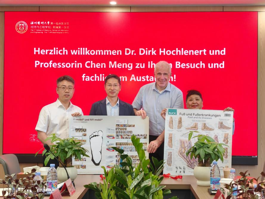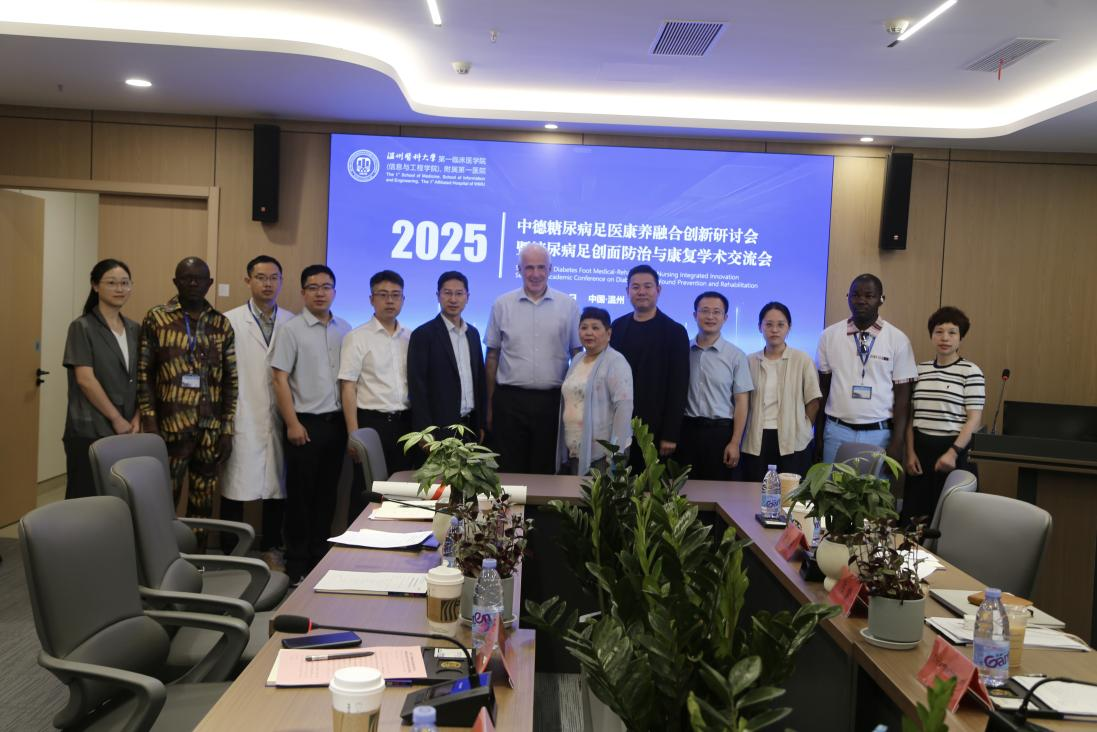 5月10日,由我院创面修复与再生医学中心、创面修复科主办的中德糖尿病足医康养融合创新研讨会暨糖尿病足创面防治与康复学术交流会召开。欧洲糖尿病研究学会糖尿病足研究学组委员、德国糖尿病协会足部工作组副主席Dirk Hochlenert教授,国际足病师学会委员、国际本体感受与生物力学学会委员陈梦教授,瓯江实验室PI、浙江省万人计划人才何华成研究员,温州大学鞋履设计教研室主任、国家一级鞋类设计师、浙江工匠祝忠良副教授,我院副院长、创面修复与再生医学中心副主任陈咨苗,创面修复科执行主任王健,康复科副主任邓斌斌,创伤骨科周海波副主任医师参加会议。会议由创面修复科副主任陈雄主持。