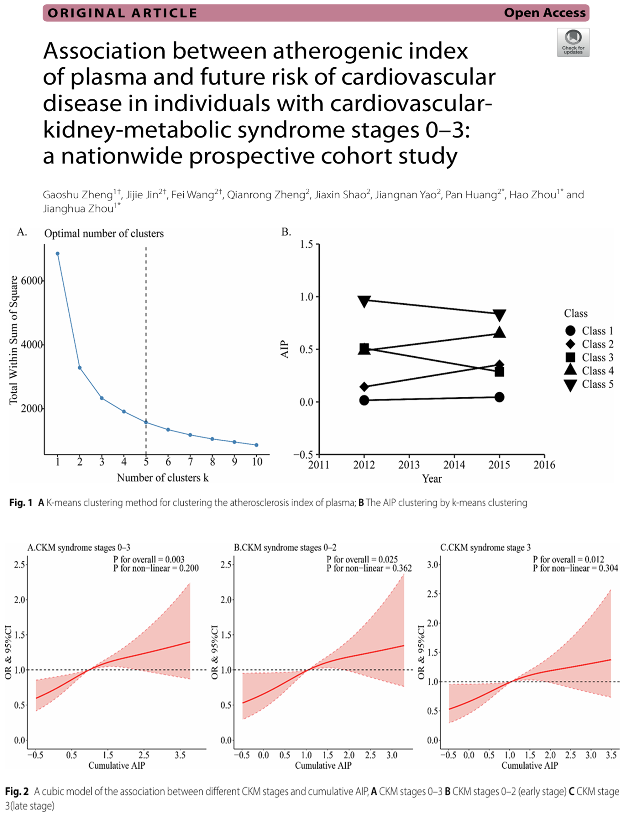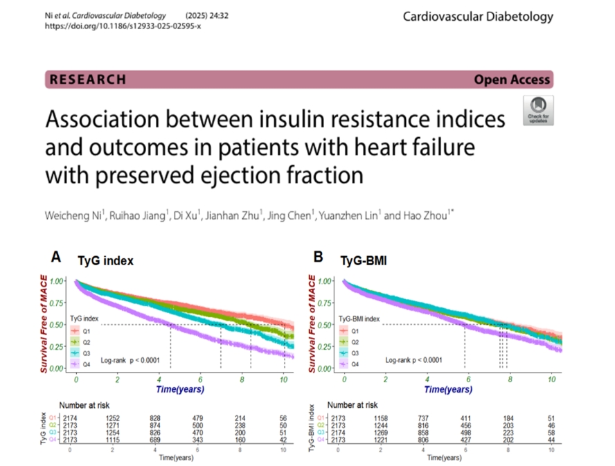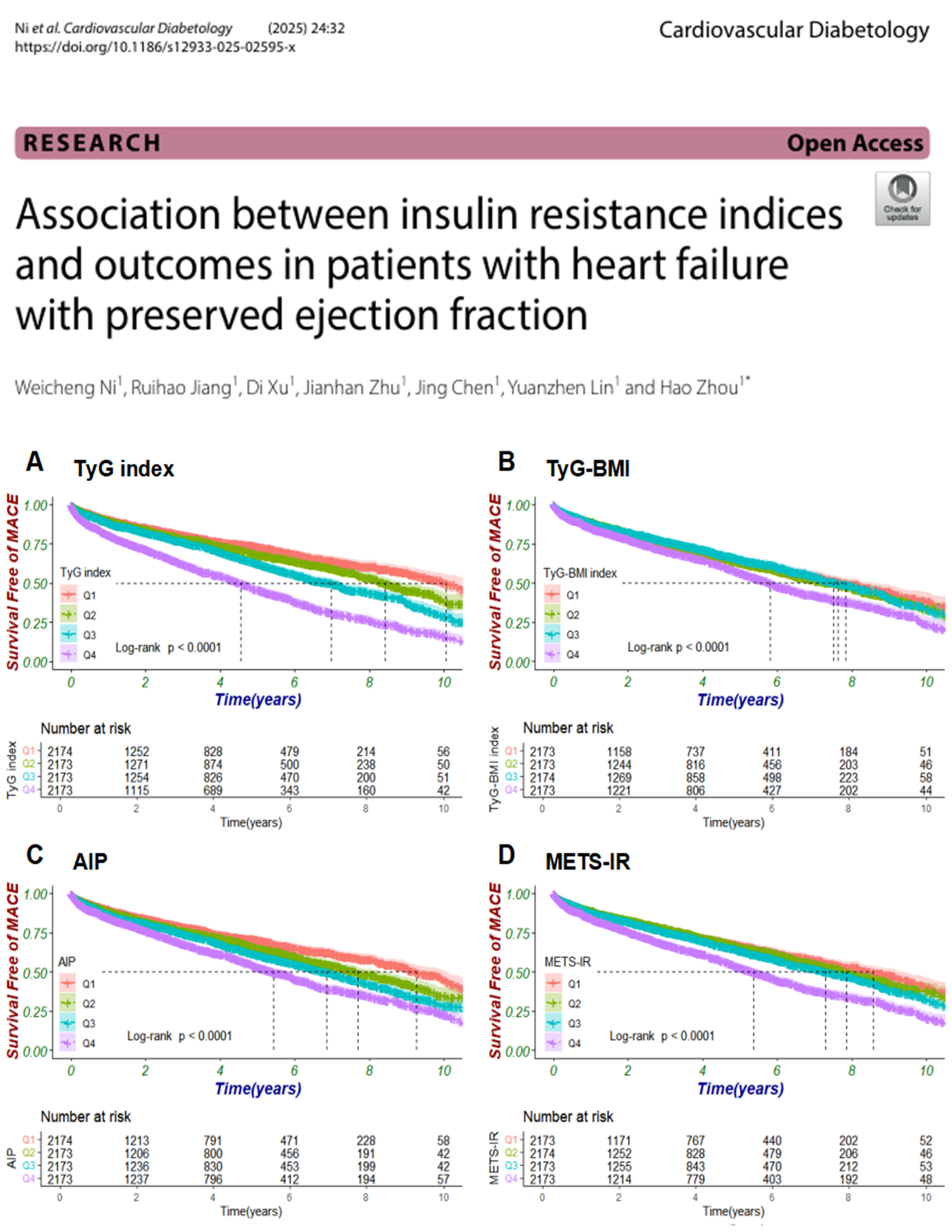 今年上半年,心血管内科周浩教授团队在Cardiovascular Diabetology(中科院一区,IF: 10.6)连续发表两项研究,题为Association between insulin resistance indices and outcomes in patients with heart failure with preserved ejection fraction和Association between atherogenic index of plasma and future risk of cardiovascular disease in individuals with cardiovascular kidney-metabolic syndrome stages 0–3: a nationwide prospective cohort study,分别聚焦射血分数保留性心衰(HFpEF)和CKM综合征人群,首次系统揭示IR相关指标的预后价值及动态监测意义。