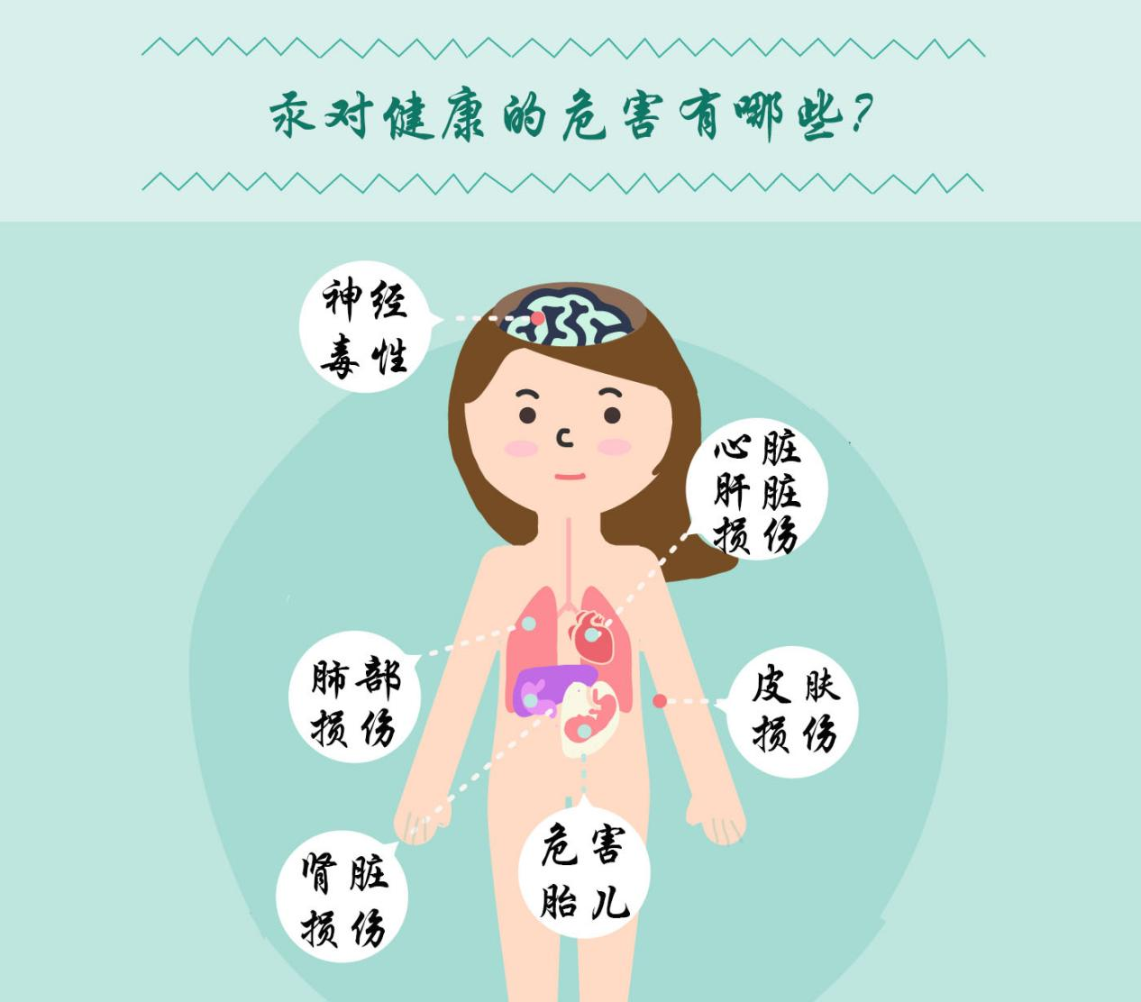 日常生活中,我们用来测量的水银体温计中随温度升高的亮晶晶的物质就是水银,学名为“汞”。水银体温计破碎后汞掉落在地上会形成许多大小不等的银色小球,如果不及时收集处理很快就会挥发到空气中变成汞蒸气。汞蒸气有很大的毒性,在短时间里吸入高浓度汞蒸气(大于1.0mg/m³),就会导致肺和神经系统毒性,大量或长时间暴露也可导致肾毒性。日本著名的水俣病事件就是直接由汞对海洋环境污染造成的公害。一旦吸收,所有形式的汞都会穿过胎盘,并可能将这种潜在的中毒症状遗传给后代。